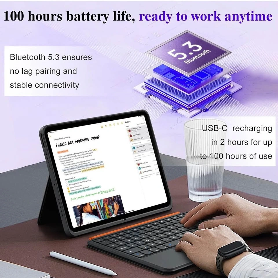 Slim Design & Bluetooth No Lag: iPad keyboard 0.25 inch ultra-thin design. The foldable stand adjusts from 0°to 170°, fill needs for different angles. Bluetooth 5.3 ensures instant, no lag pairing and stable connectivity. Easily switch to work mode during commutes or in cafes