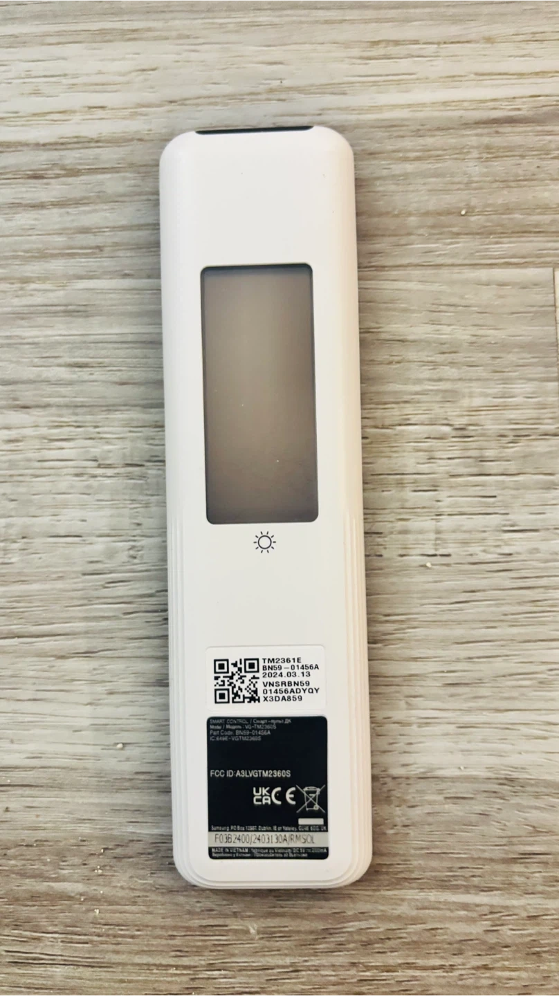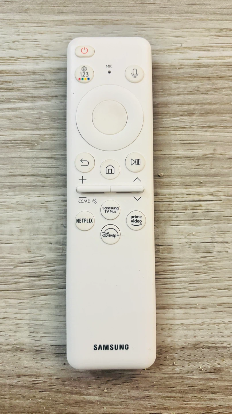 This is a Samsung smart TV remote control. It has dedicated buttons for Netflix, Disney+, and Prime Video. Power button, volume controls, and navigation are included.