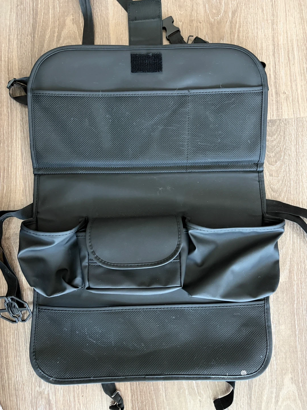 Black car seat back organizer with foldable dinning table, tissue holder and a clear tablet holder. Keeps your car tidy and essentials within reach. Durable material for long-lasting use.