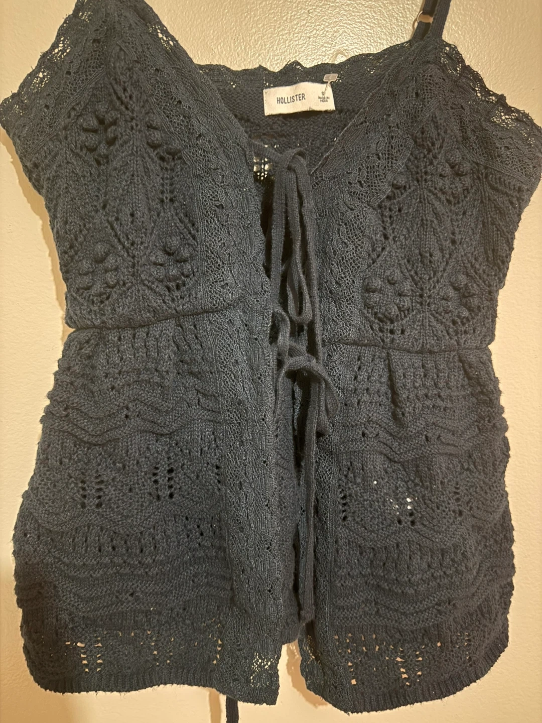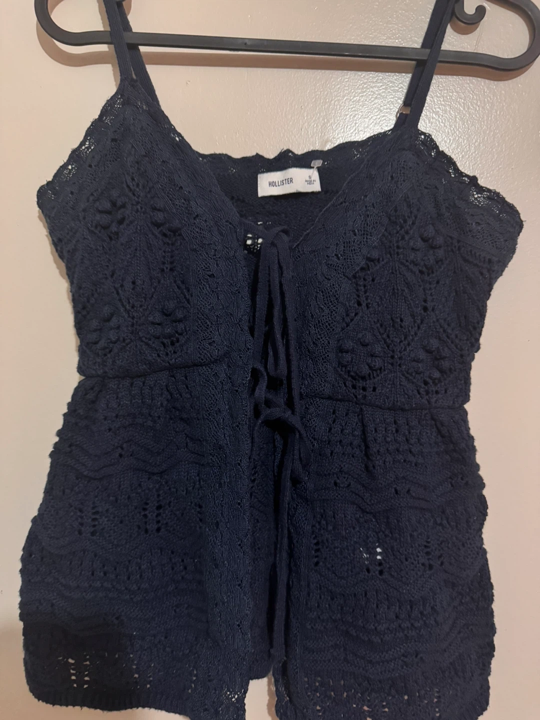 This navy Hollister tank top features a lace-up front and a textured knit design. It's a size small. The material is soft and breathable, perfect for warmer weather.