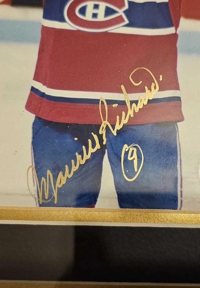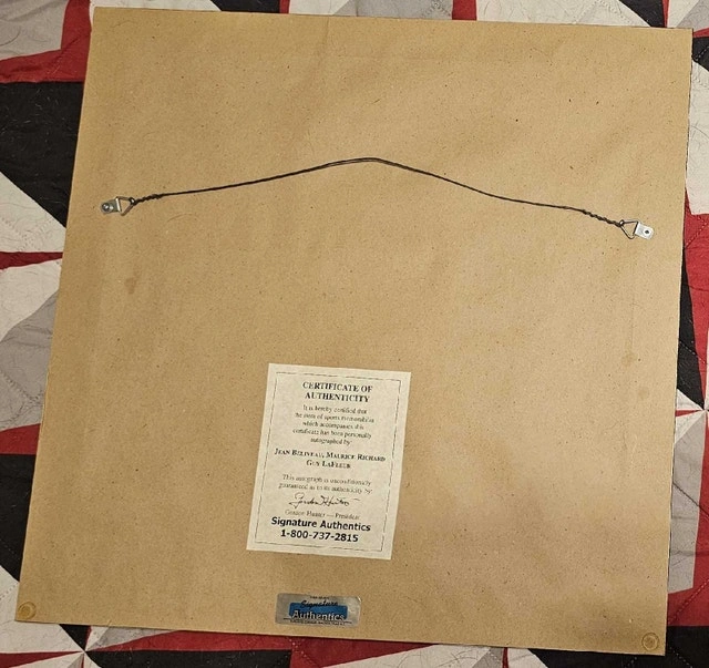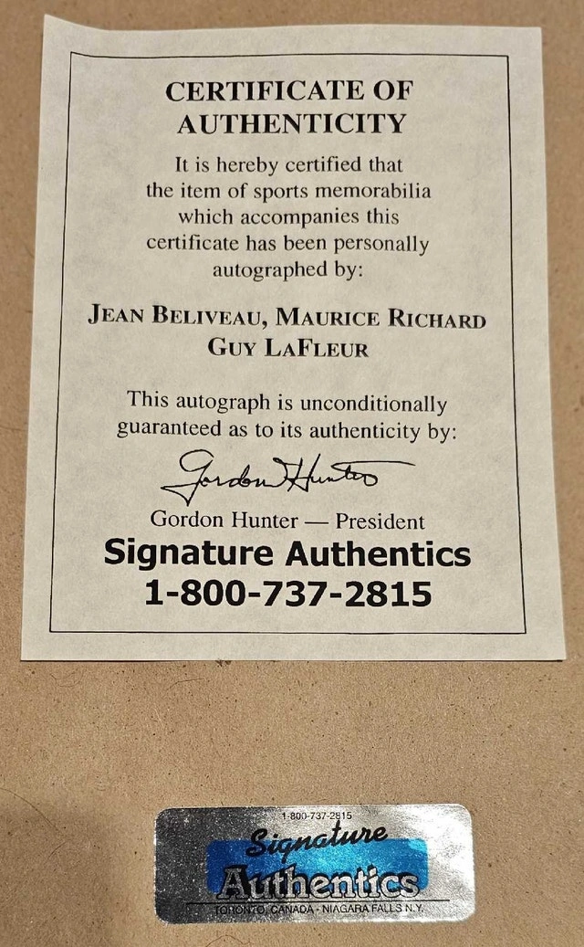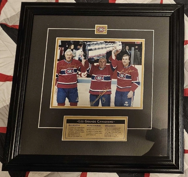 I'm offering a framed and signed photo of Les Grands Canadiens - Jean Beliveau, Maurice Richard, and Guy Lafleur. This collectible piece features the autographs of these hockey legends and comes with a certificate of authenticity. It's a great item for any Montreal Canadiens fan or sports memorabilia collector. This item is used, so please consider its condition. Here are the details: * Signed by Jean Beliveau, Maurice Richard, and Guy Lafleur * Framed with a certificate of authenticity * Great for collectors If the ad is up, it's available!