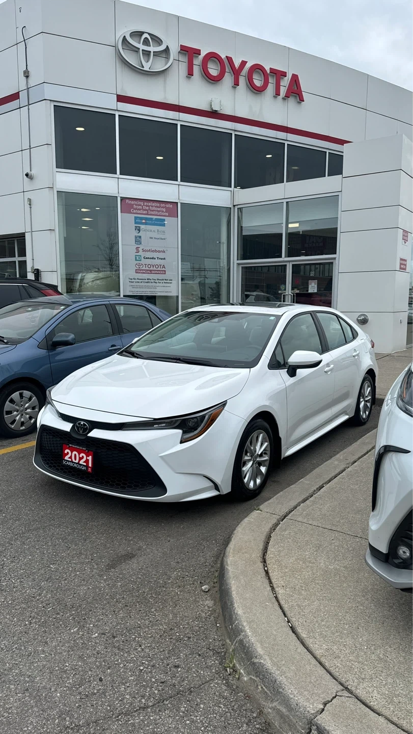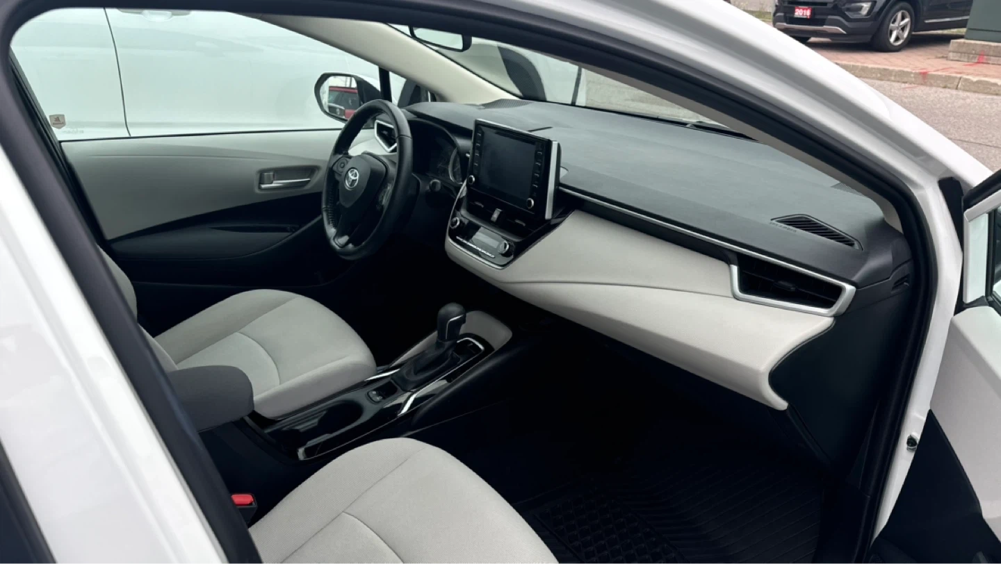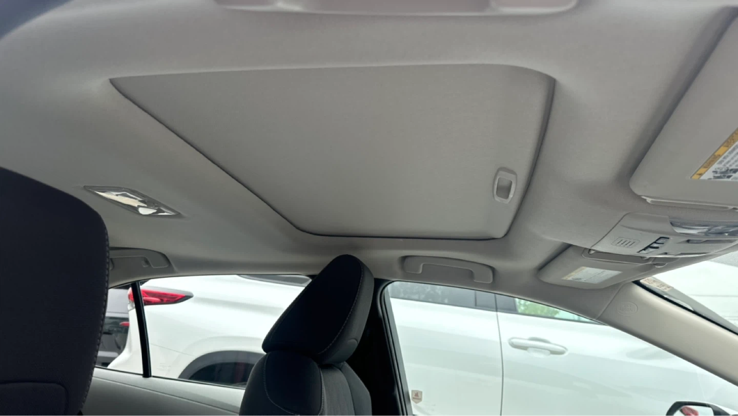 White Toyota Corolla LE sedan. Interior features light grey and black fabric seats with a sunroof. This compact car offers a comfortable ride for daily commutes.