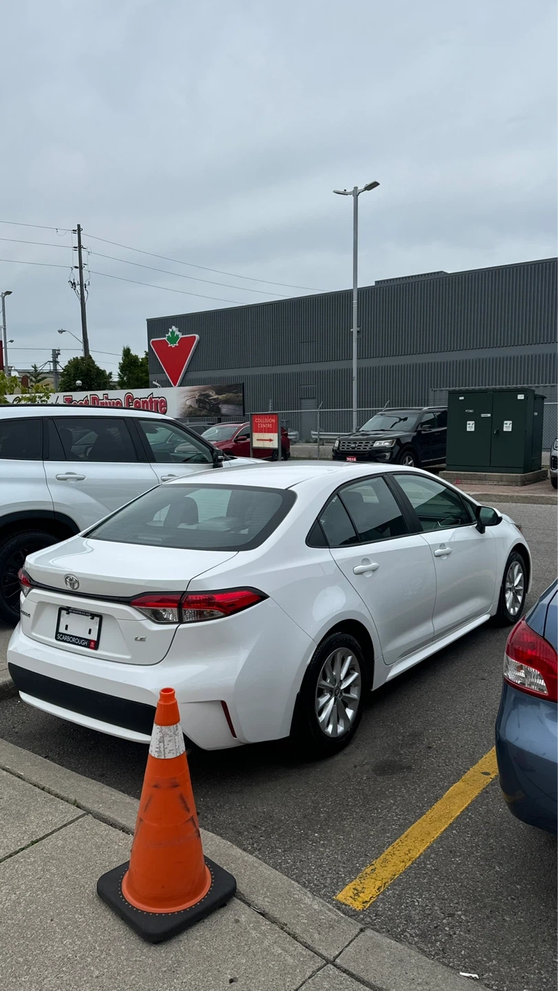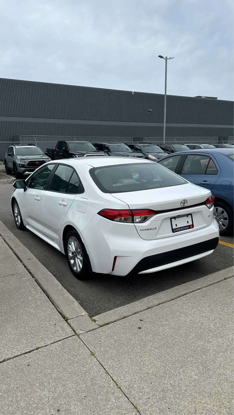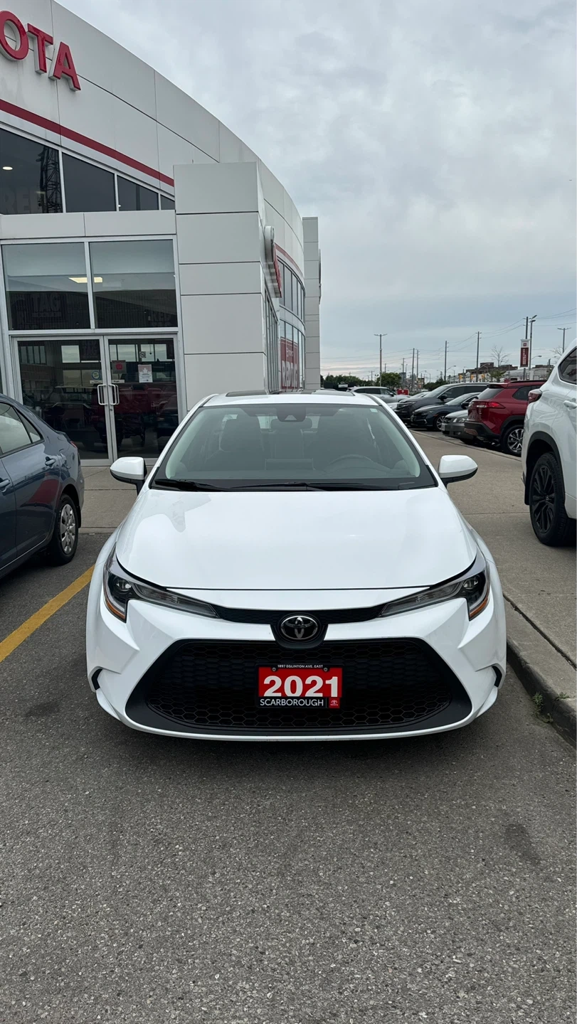 White Toyota Corolla LE sedan. Interior features light grey and black fabric seats with a sunroof. This compact car offers a comfortable ride for daily commutes.
