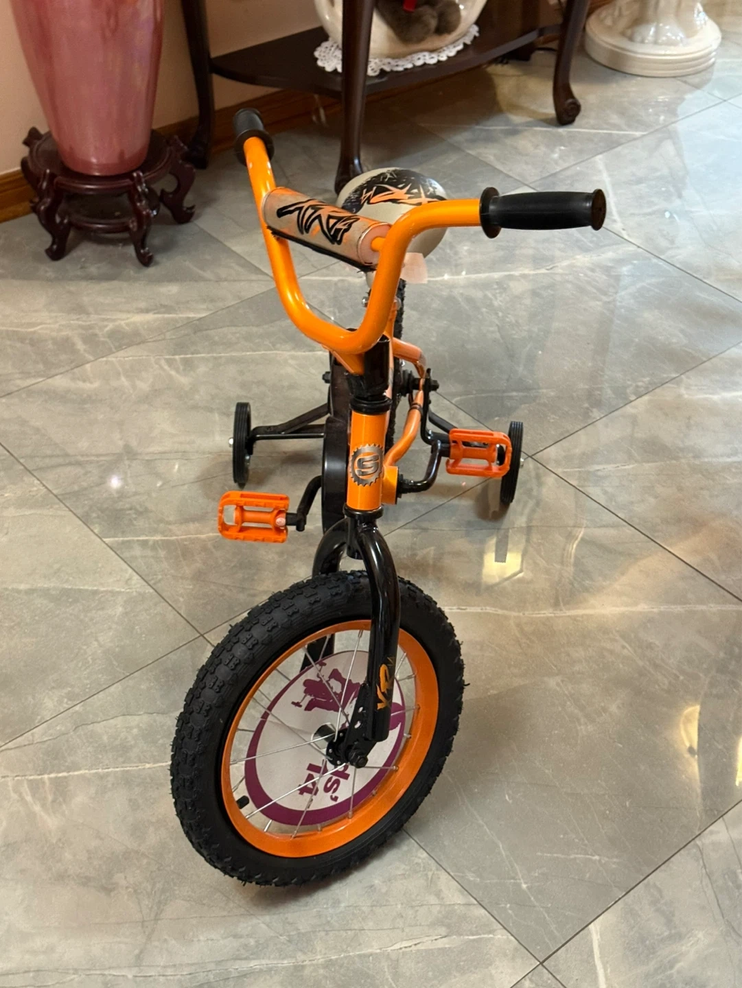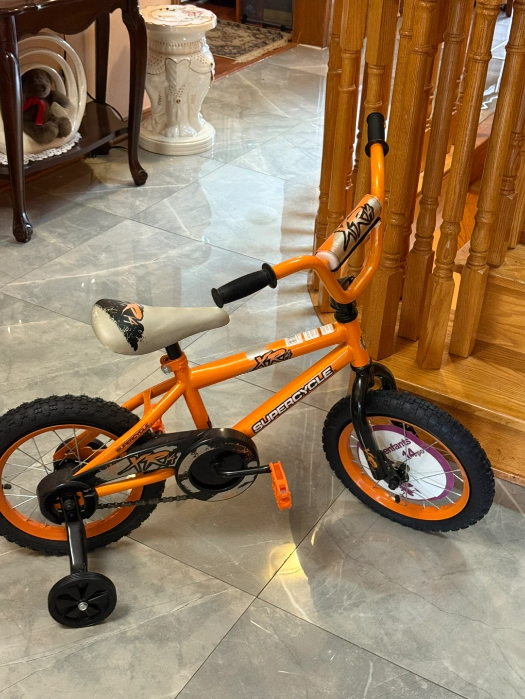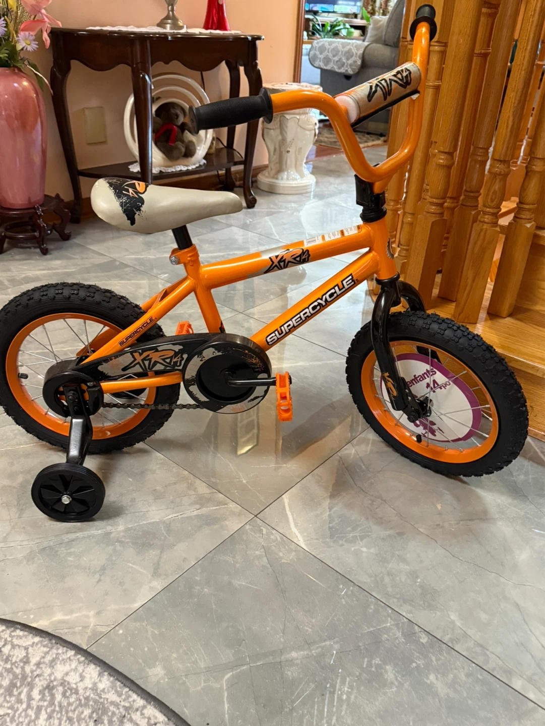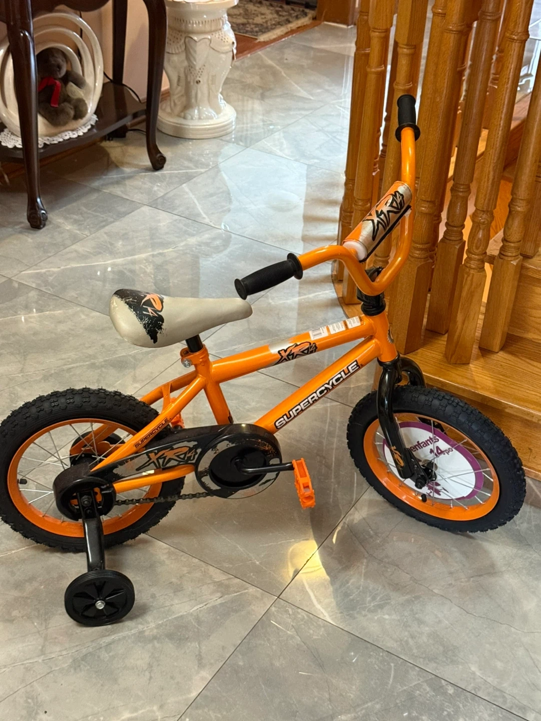 Orange Supercycle kids tricycle with training wheels. It's a great way for little ones to learn balance and coordination. Perfect for outdoor fun! 14 inches