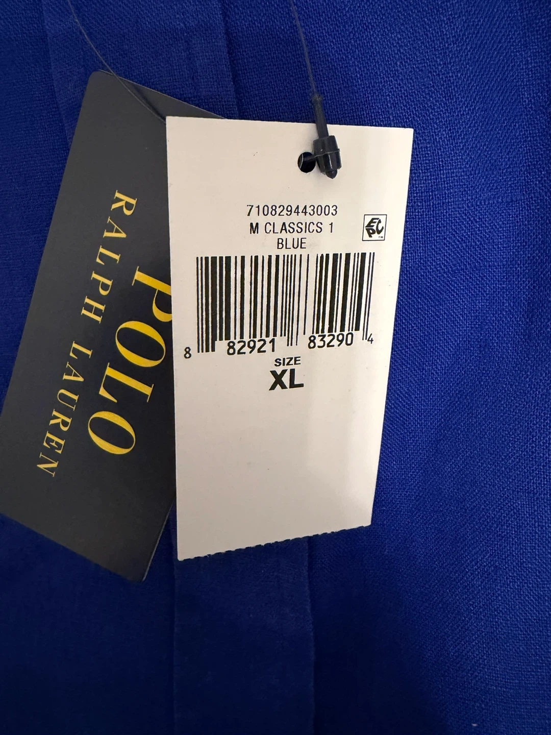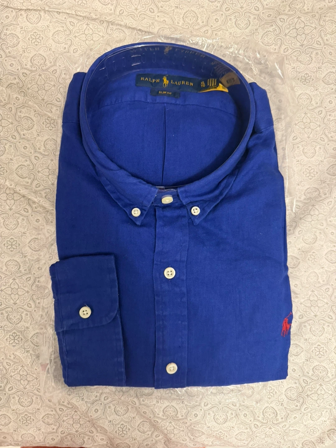 This is a Ralph Lauren Slim Fit button-down shirt. It's made of linen and comes in a royal blue colour. Size XL.