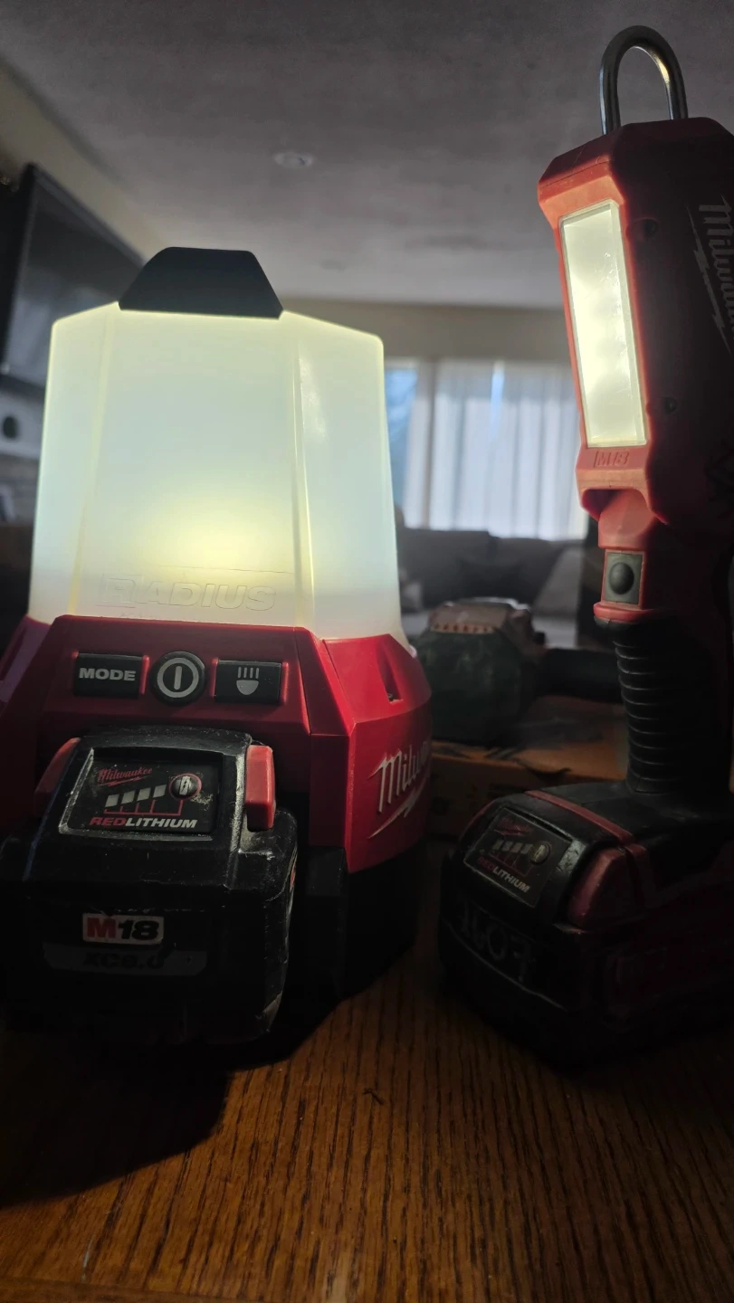 Two Milwaukee M18 work lights, including a Radius lantern and a compact site light. Both lights run on M18 REDLITHIUM batteries. They're great for providing light in various work or outdoor settings.