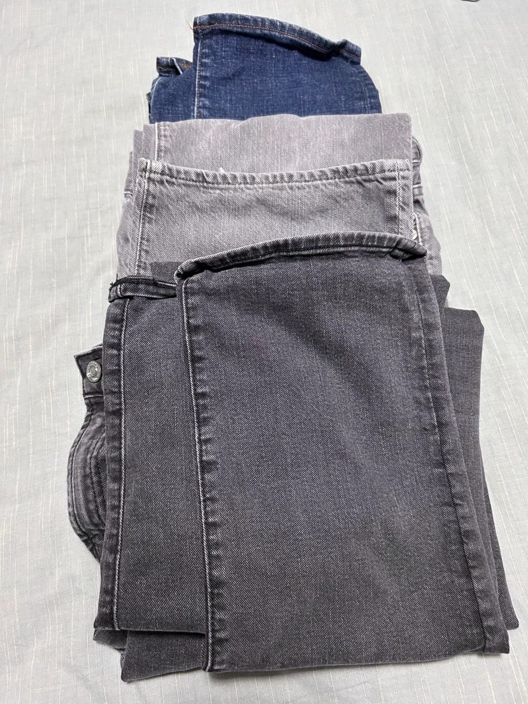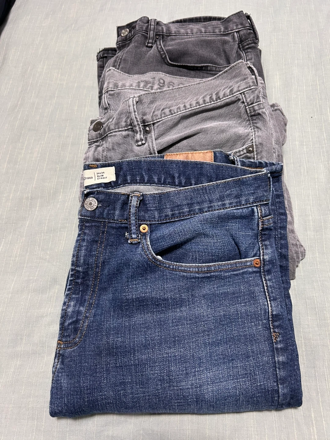Three pairs of GAP jeans in various washes. Includes blue, grey wash, and black wash denim. Men's size 34 x 34. Slim cut.
