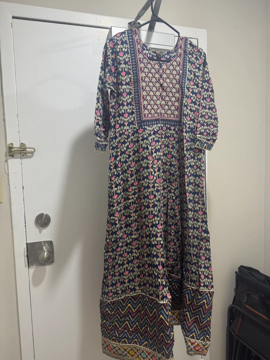 Dark blue dress with a busy floral and geometric print. Features a wide neckline with embroidered detail. 3/4 sleeves with a patterned cuff. The hem has a contrasting zigzag pattern. It's a stylish and eye-catching piece.