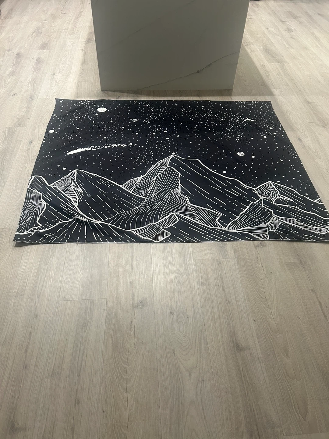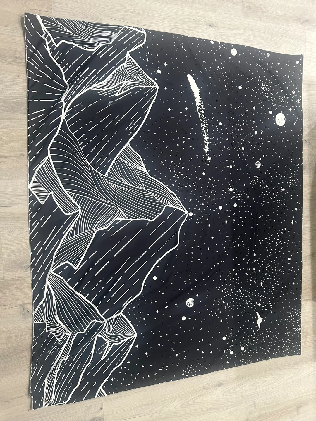 This tapestry features a striking black and white of mountains under a starry night sky with the moon with a comet. It's a unique piece for decorating any room. The tapestry is quite large and light weight
