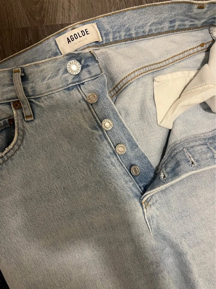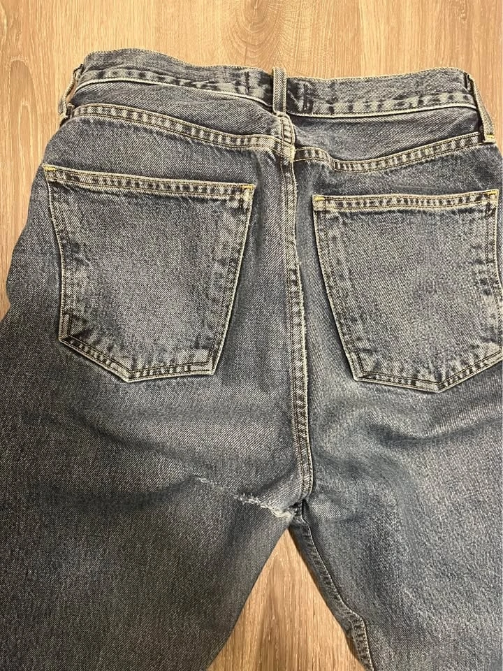 Two pairs of Agolde jeans. Dark Wash Size 23 (fits like 25) and Light Wash Size 25. Both pairs ripped in the same area. Both are a thicker style denim with no stretch. Could be up-cycled for an art project or repaired if desired. Each pair retails for +$300.