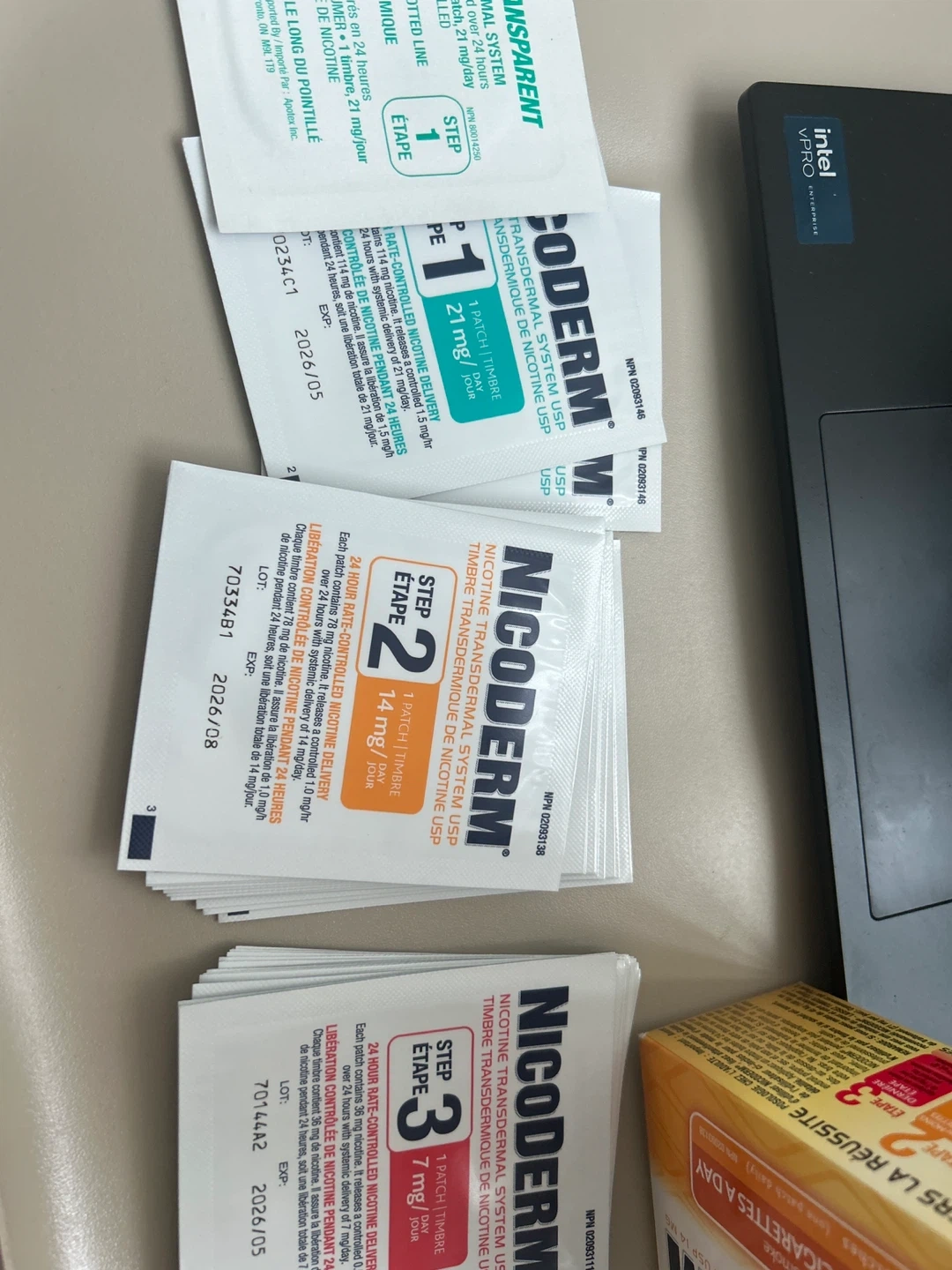 This is a lot of Nicoderm transdermal nicotine patches. It includes Step 1 (21 mg), Step 2 (14 mg), and Step 3 (7 mg) patches. Each step's expiry date is visible: Step 1 on 2026/05, Step 2 on 2026/08, and Step 3 on 2026/05. These are designed for rate-controlled nicotine delivery.