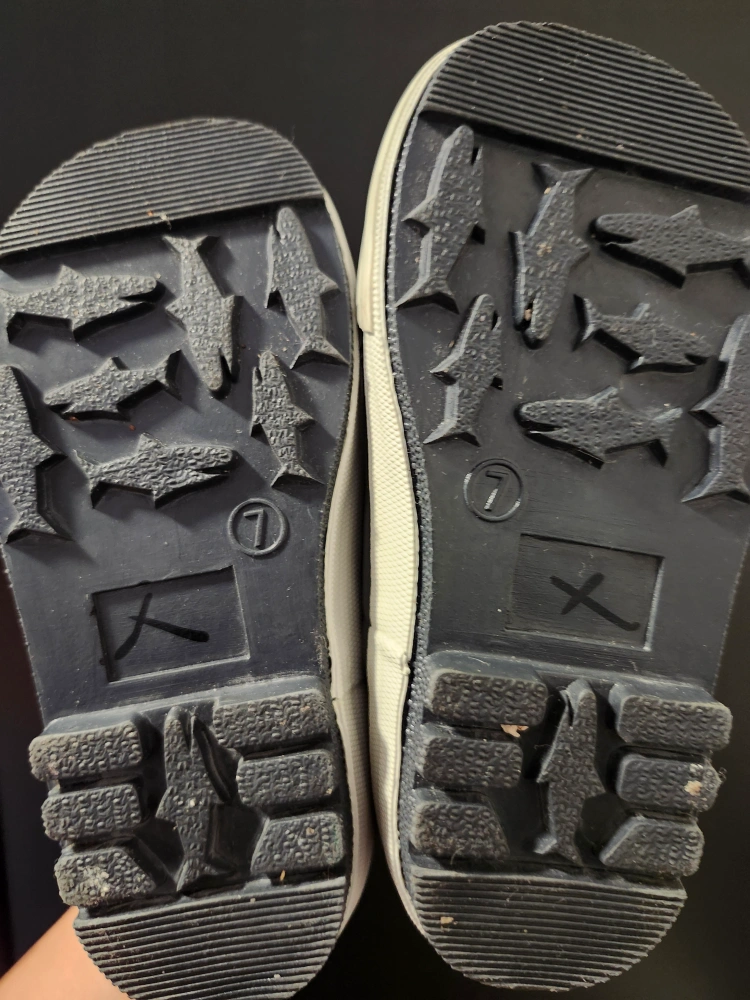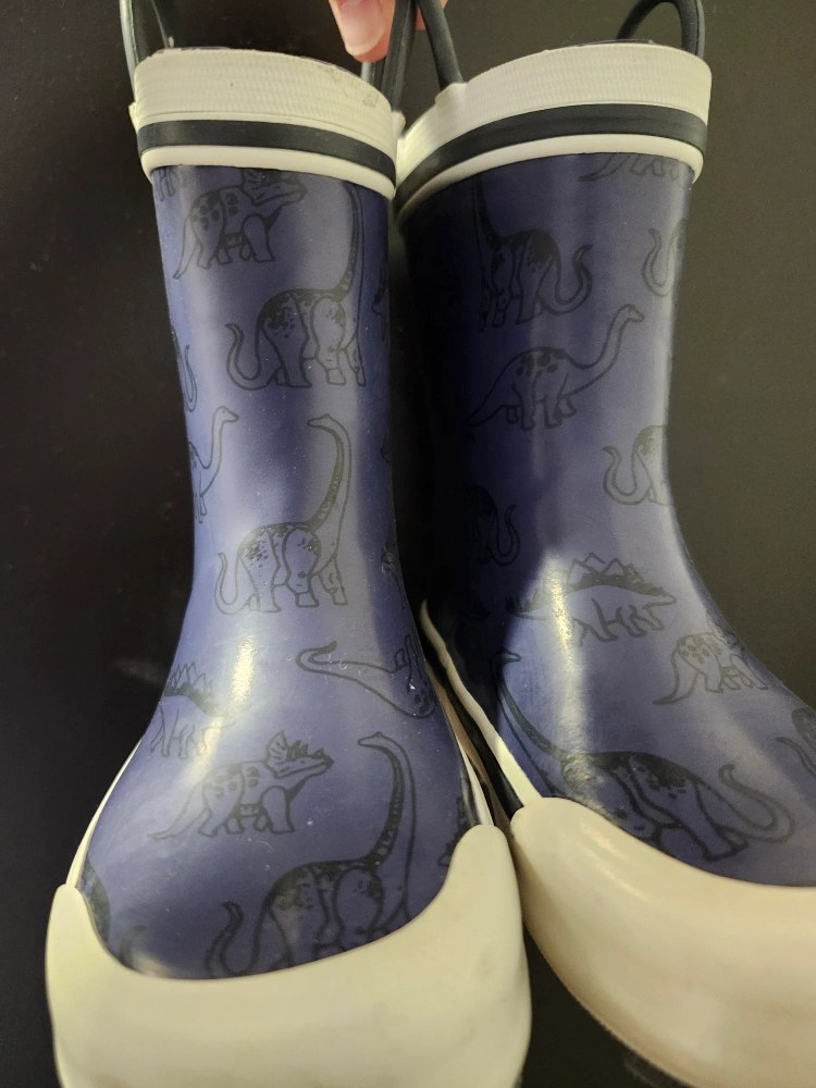 Cute pair of rain boots, perfect for puddle jumping! They're a size 7 and feature a fun dinosaur pattern on a blue background. The soles have a shark design for extra grip. only wore once