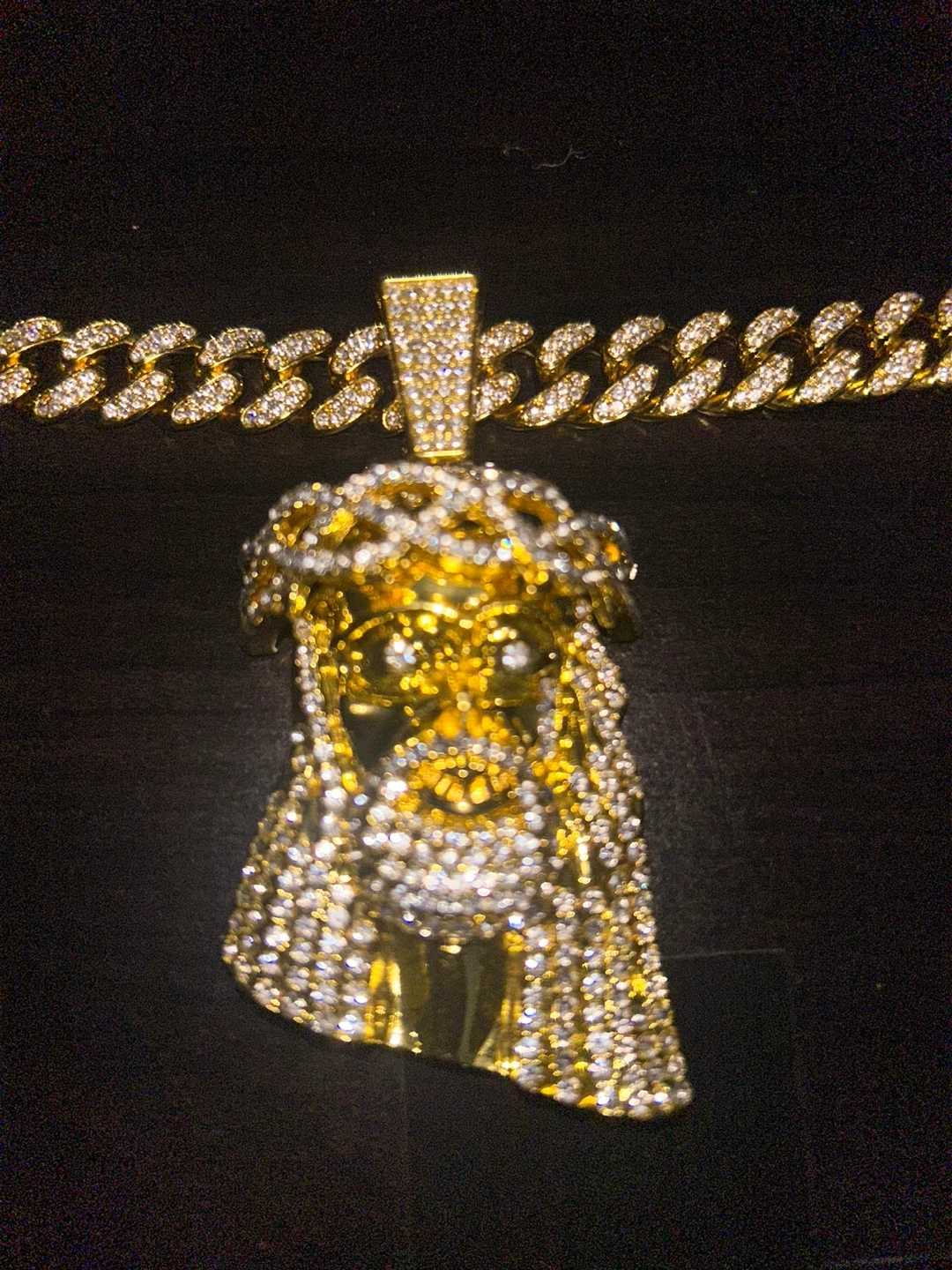 Selling a gold Jesus piece pendant necklace. It's a beautiful piece that adds a touch of bling to any outfit. The pendant is detailed and eye-catching, perfect for those who love statement jewelry