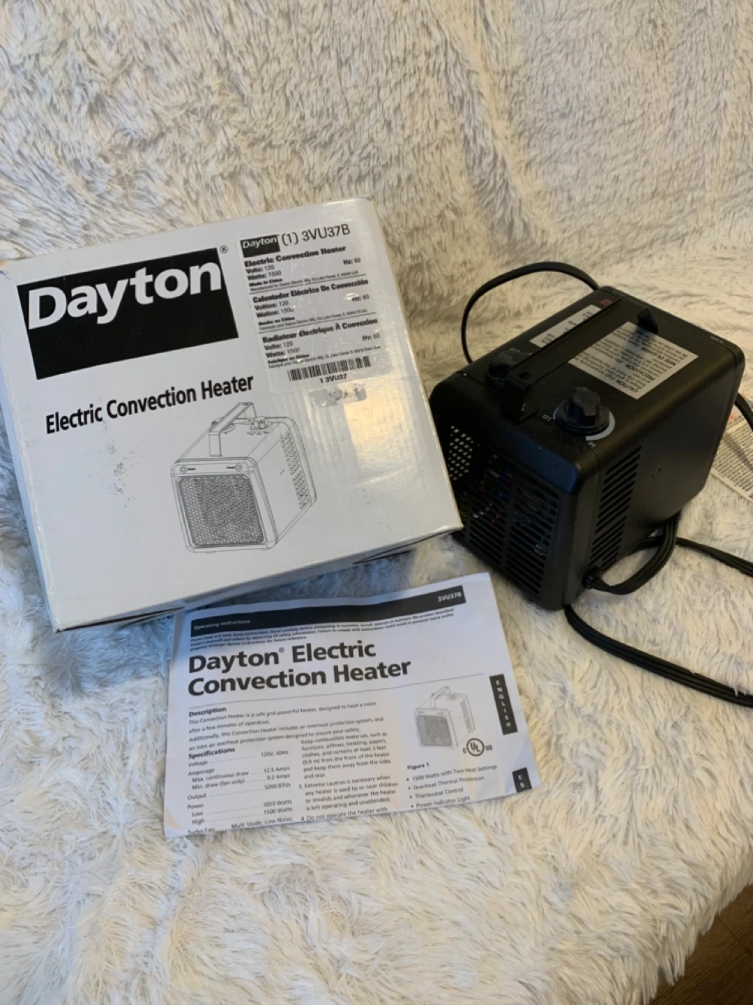 Dayton Electric Convection Heater model 3VU37B for sale. This heater is safe and protected, designed to heat a room. It includes an overload protection system and a fan design that keeps combustibles cool. It has two heat settings and overheat thermal protection. Brand new , never used.