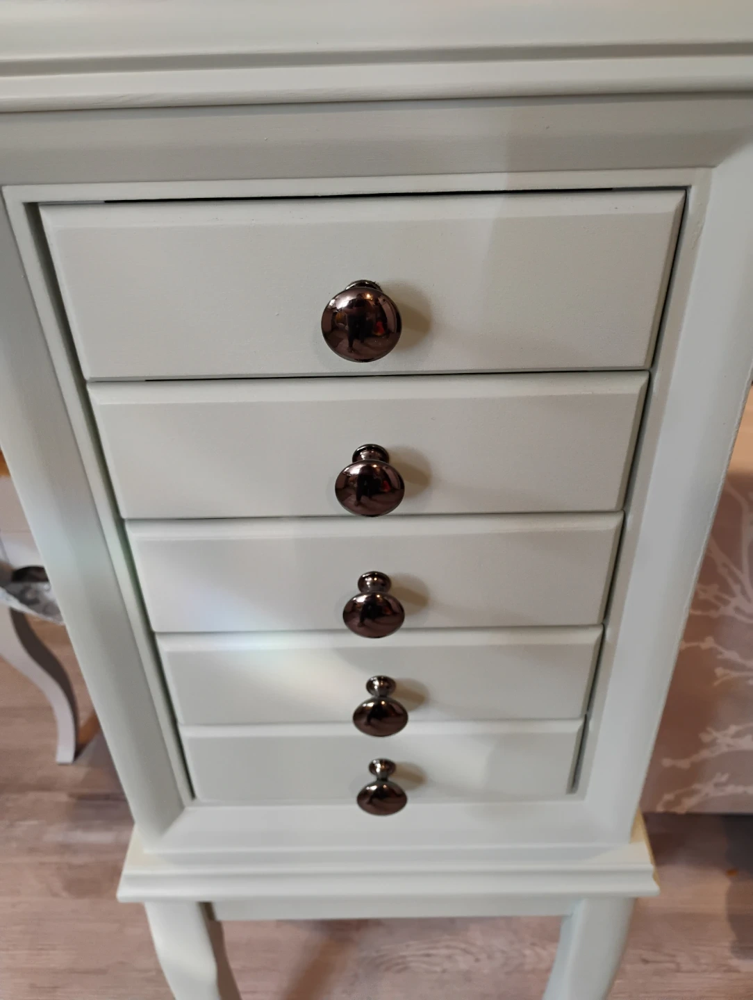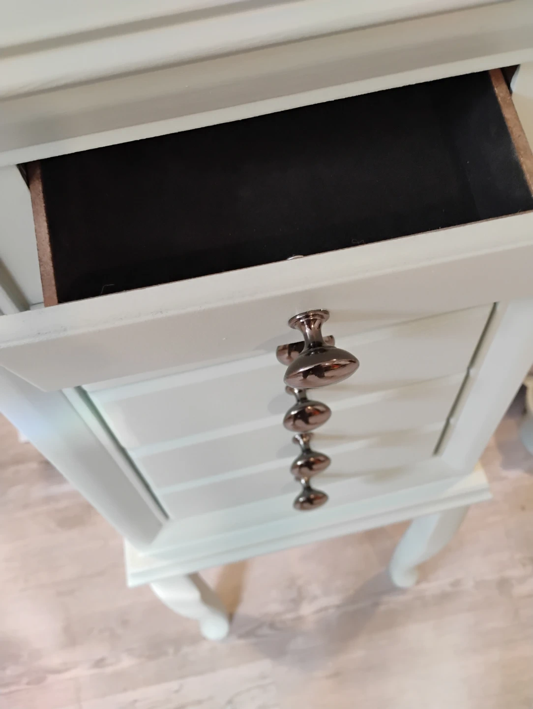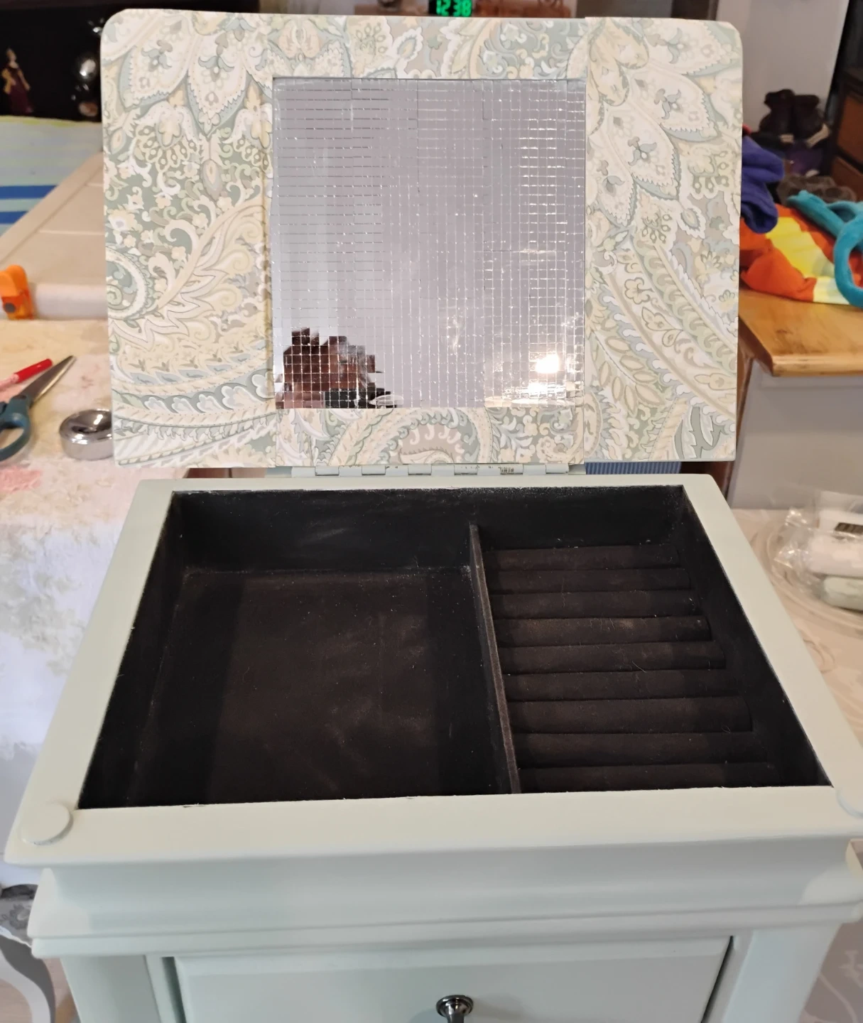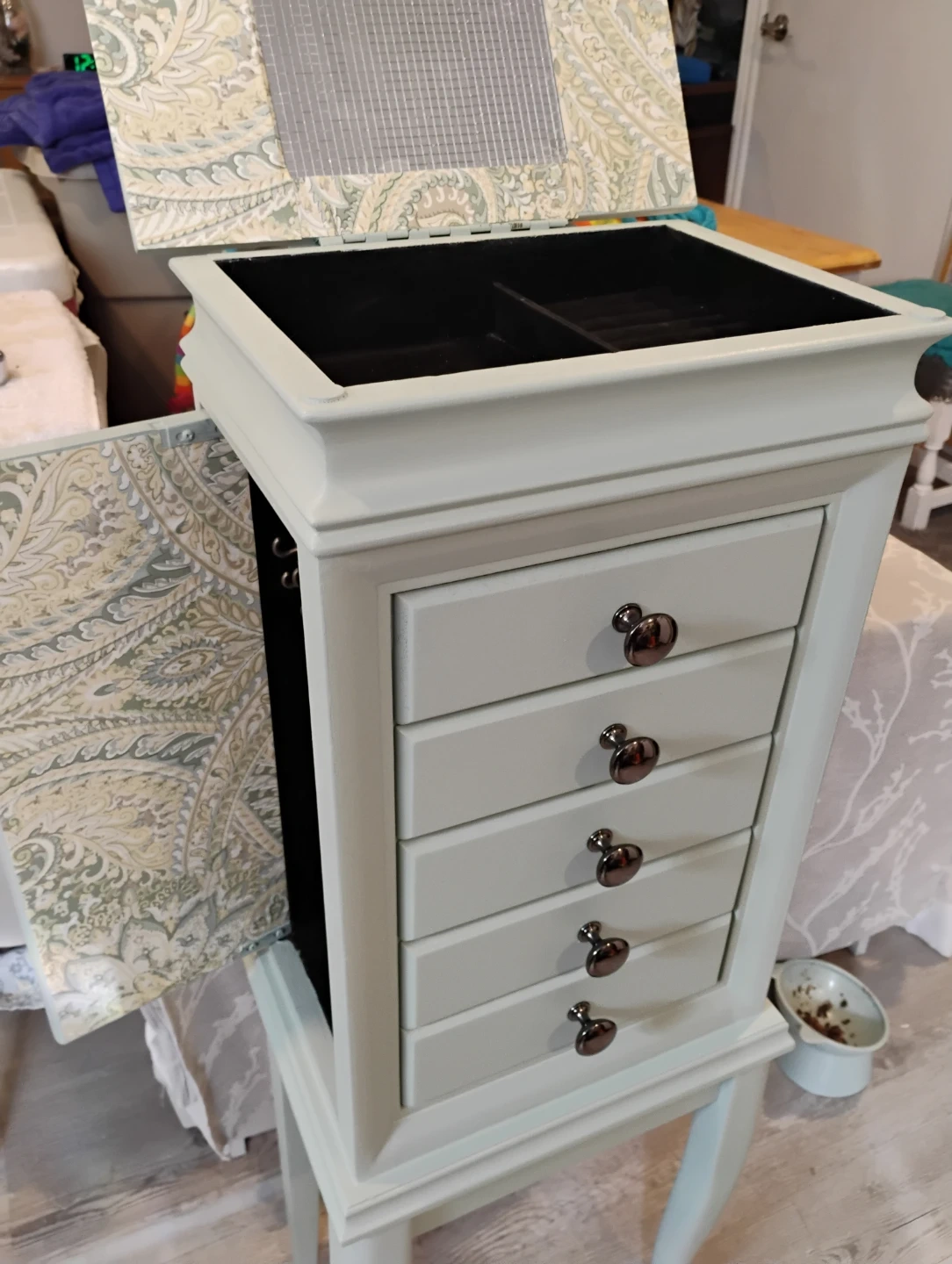 This light green freestanding jewelry armoire features a mirrored lid and multiple velvet lined drawers for storage. It includes hooks inside for hanging necklaces or bracelets. Paisley vinyl on doors interior. A great way to keep your accessories organized!