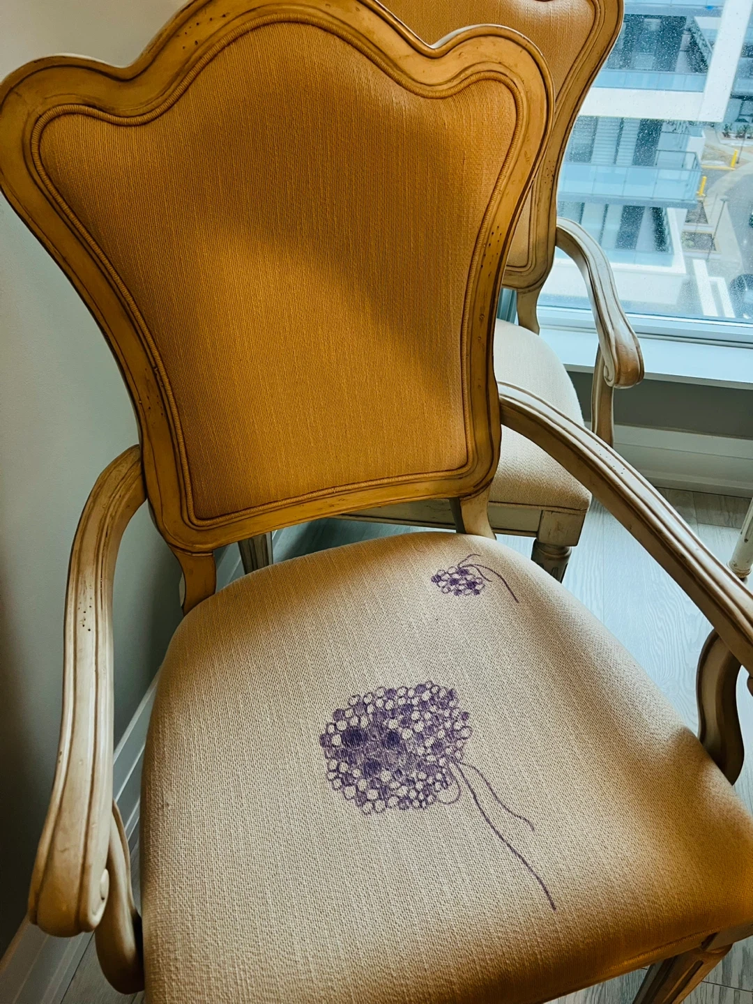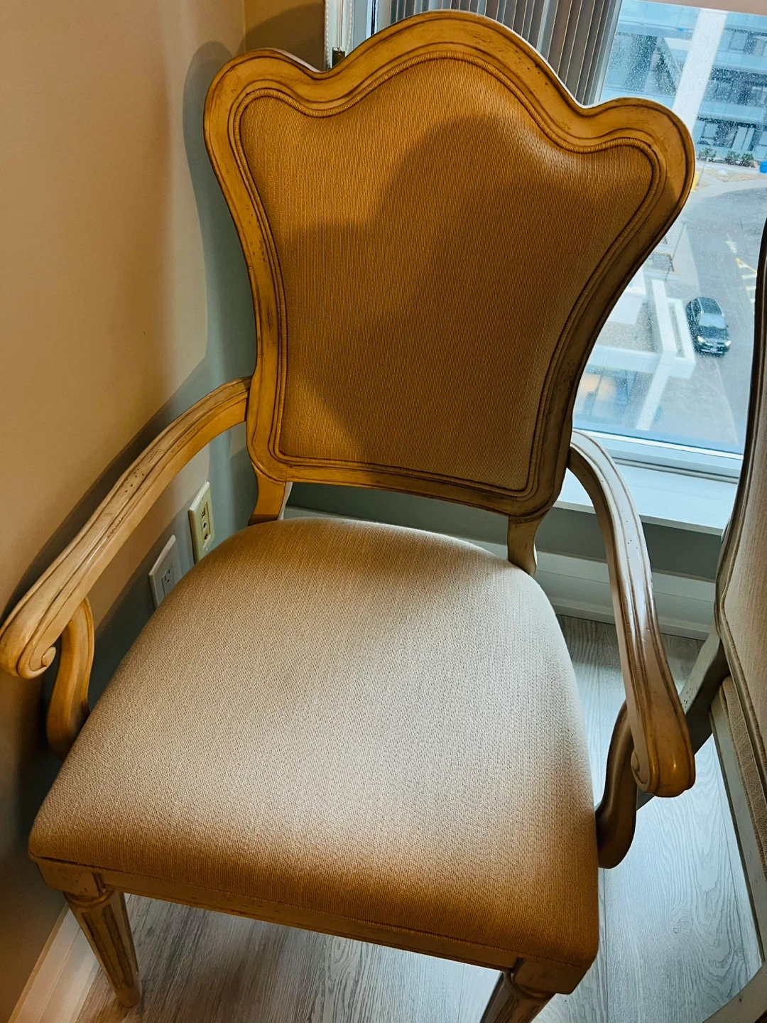 ** Please note that one of the armchairs features a custom, hand-painted floral design on the seat cushion. This was added to the fabric during a previous restaining process, giving that specific chair a one-of-a-kind, artisanal look. The painting is integrated into the fabric and does not affect the comfort or structural integrity of the chair.