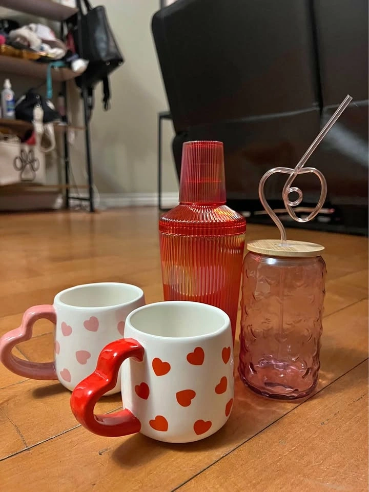 Adorable gift set available! Includes 2 matching mugs with heart design + 1 red shaker bottle + Glass. Perfect for couples, friends, or as a cute gift. Great for coffee, tea, or smoothies. All items are brand new. Bundle deal available if you add more items, check my marketplace profile!