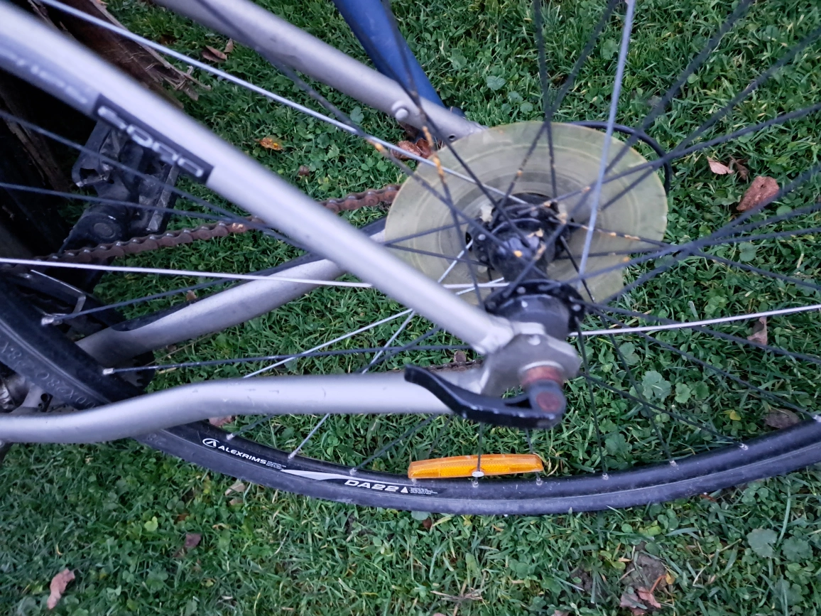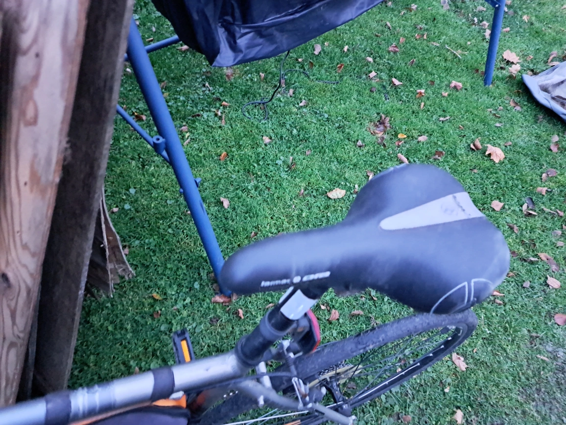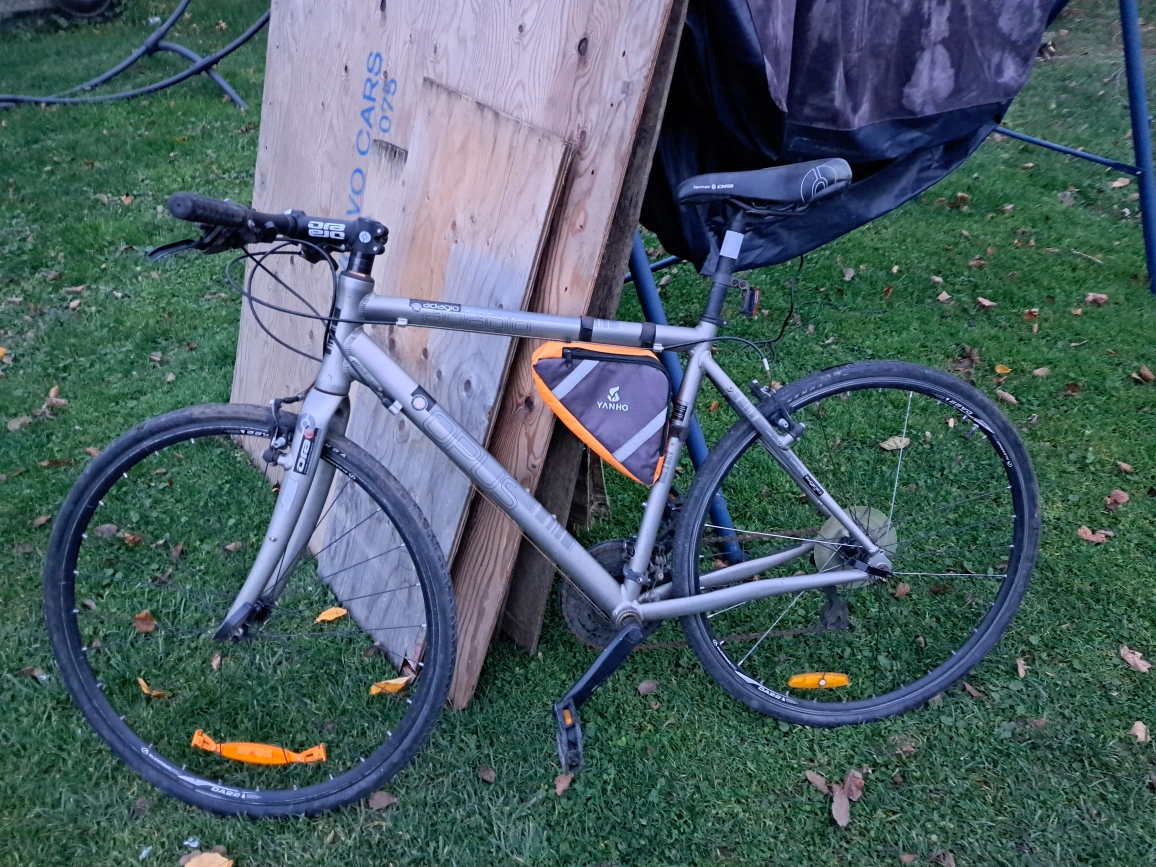 Aluminum frame, 700c wheels, Shimano components. Includes a small seat bag.