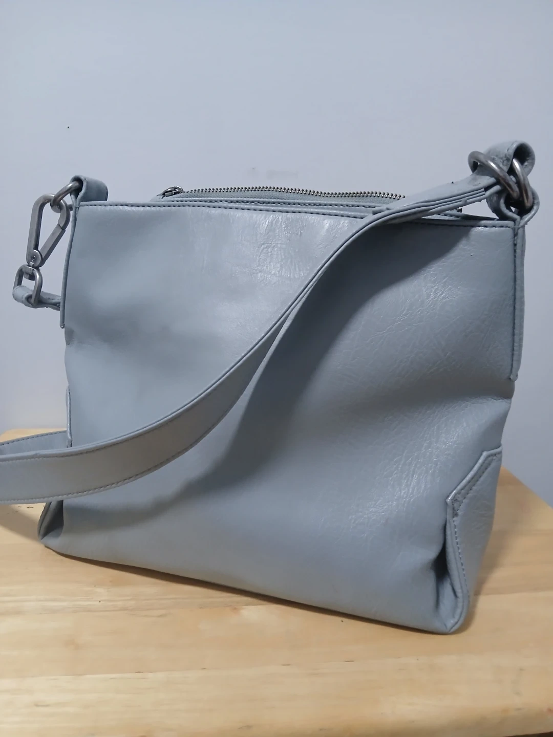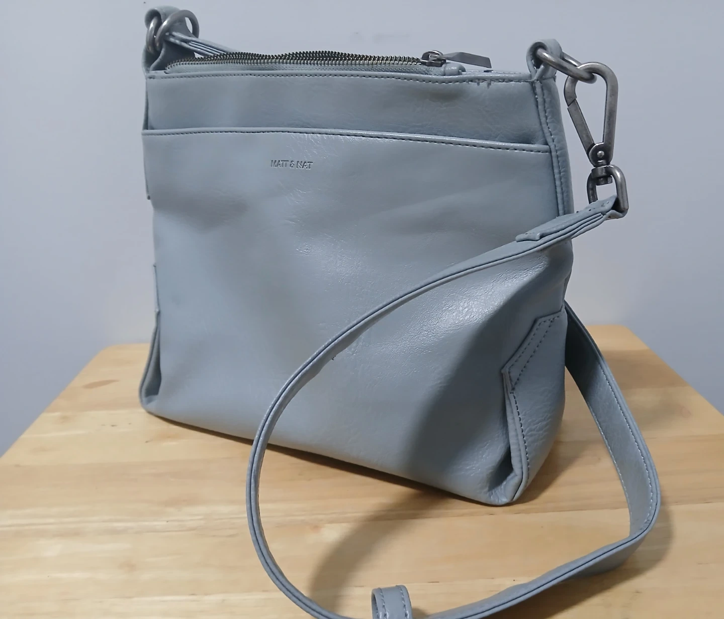 This is a Matt & Nat crossbody bag in a light grey colour. It's made of faux leather and has a zippered main compartment. Bag's dimensions are approximately 10" wide and 8" tall.