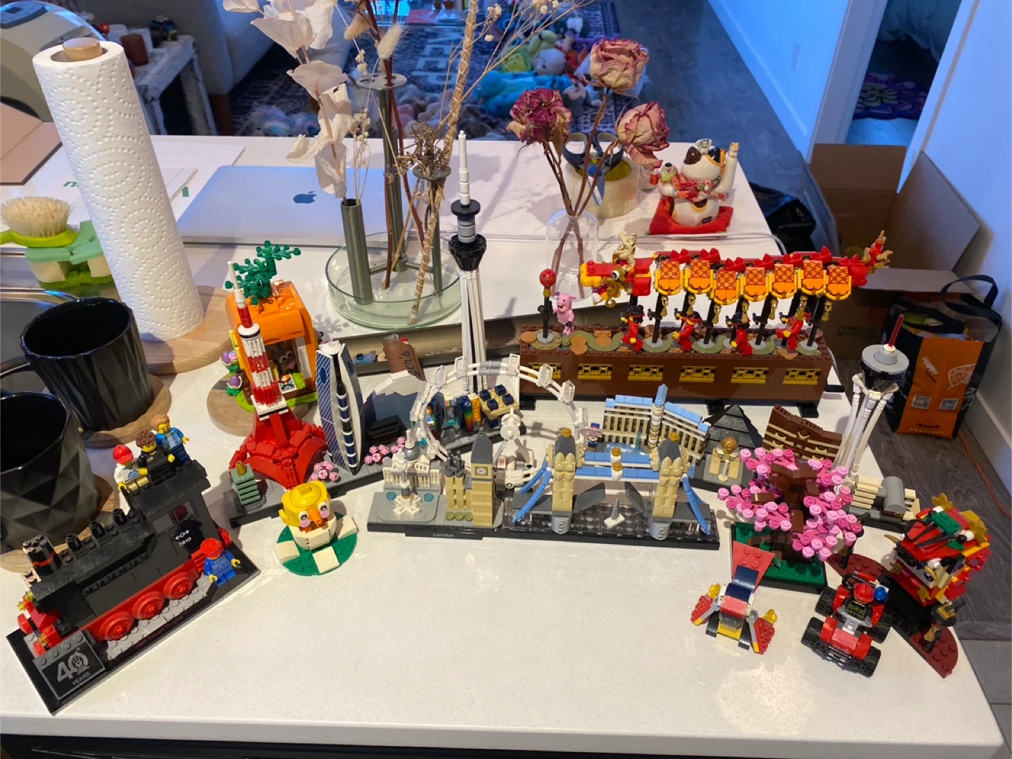 Collection of various LEGO sets including iconic buildings and a steam train. Features detailed models like the London skyline and a dragon boat. Great for builders and display!