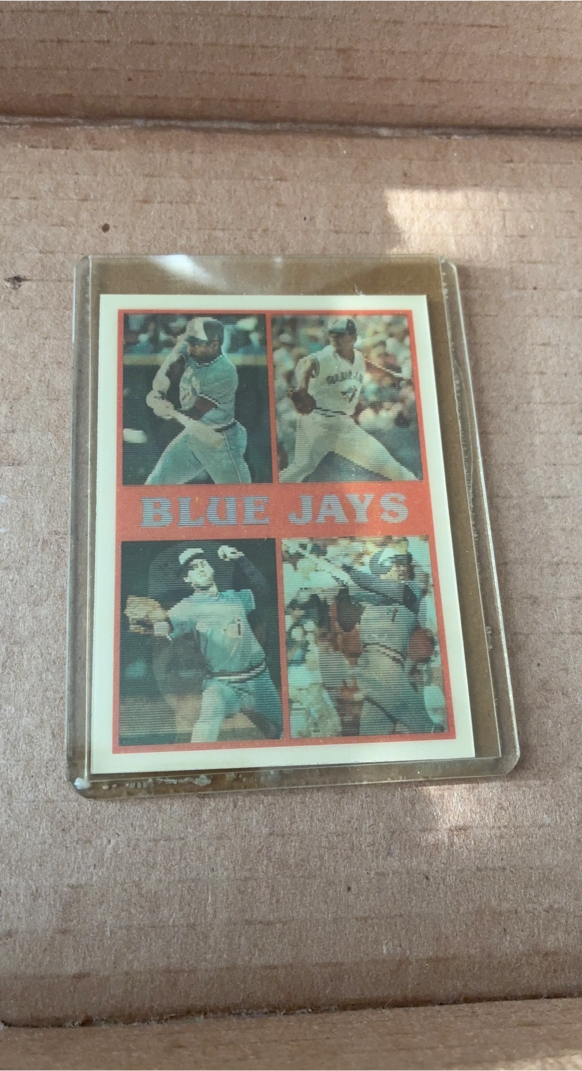 A collectible card featuring the Toronto Blue Jays baseball team. It displays four action shots of players and the team name. This card is in a protective sleeve.