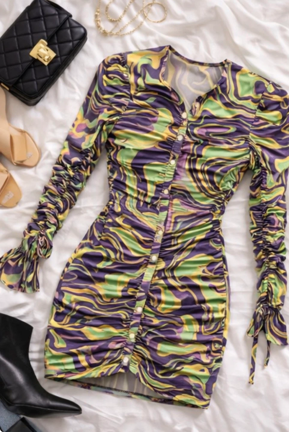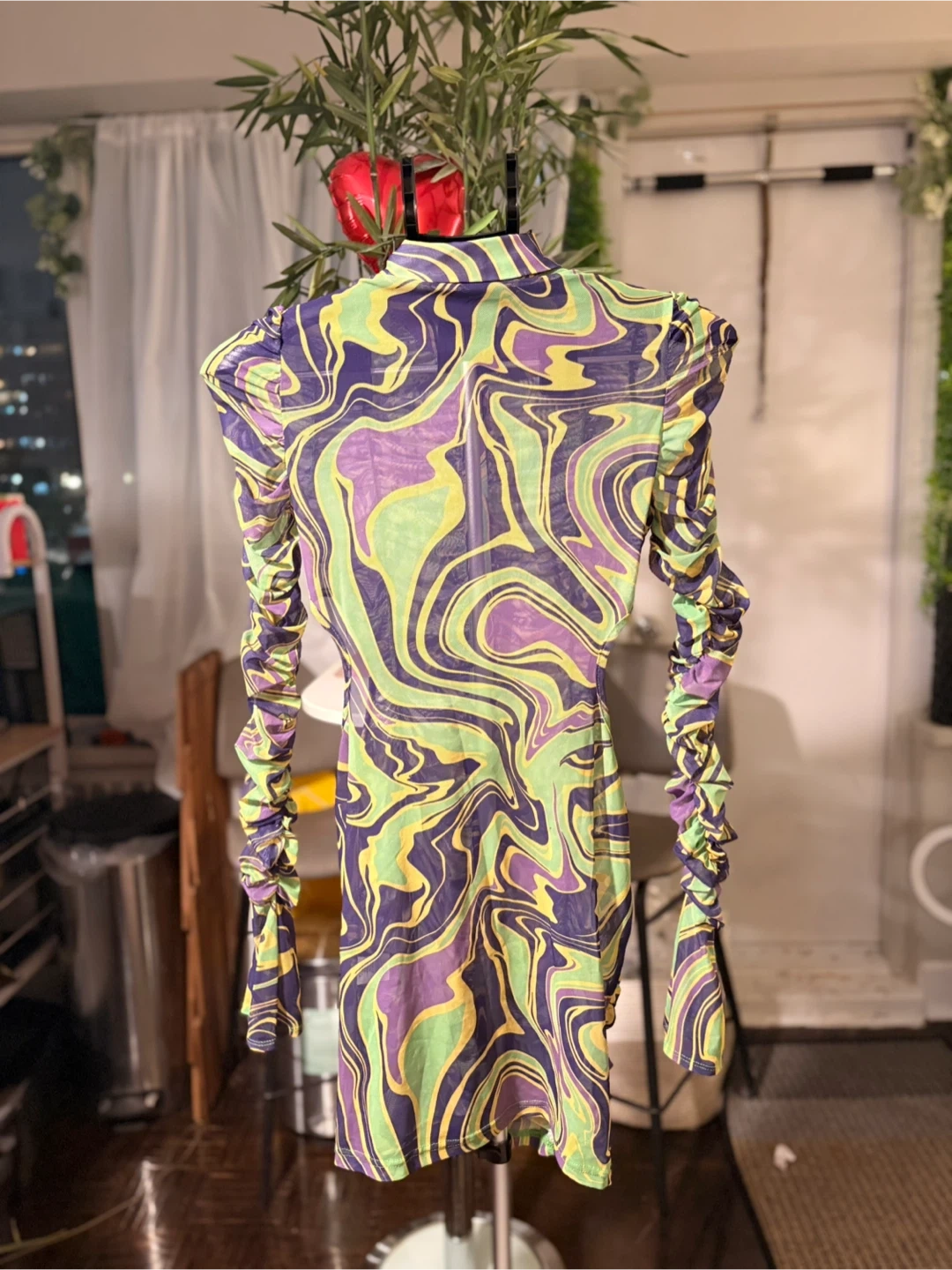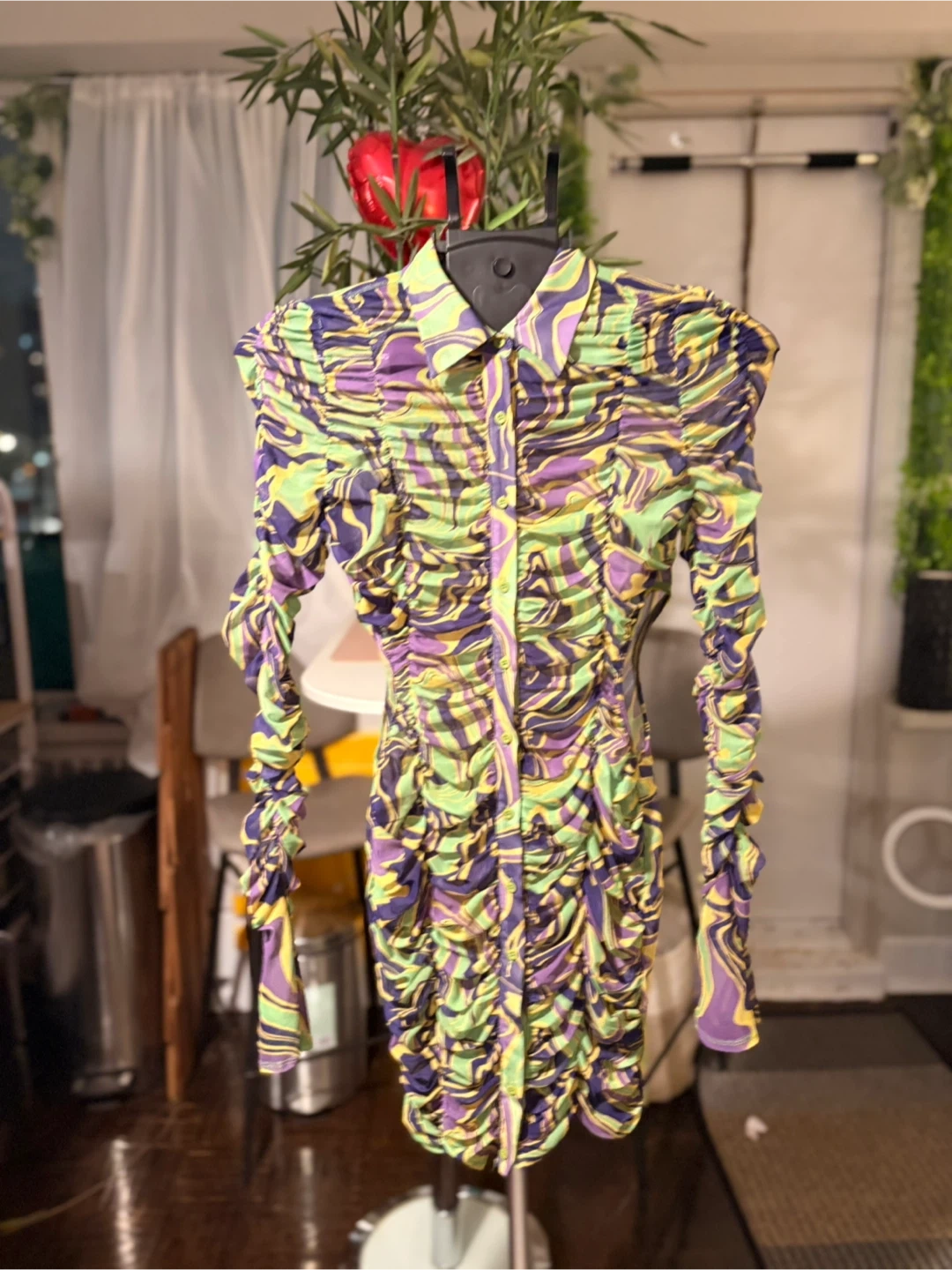 This SHEIN shirt dress features a bold swirly pattern and ruching detail. It has long, ruched sleeves with tie cuffs. The dress is button-down and made in China. Size medium.