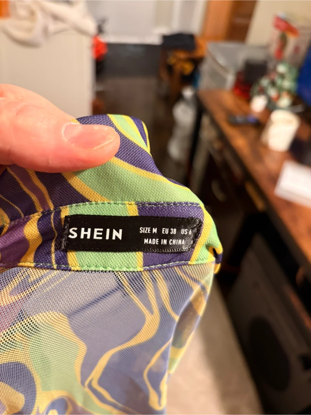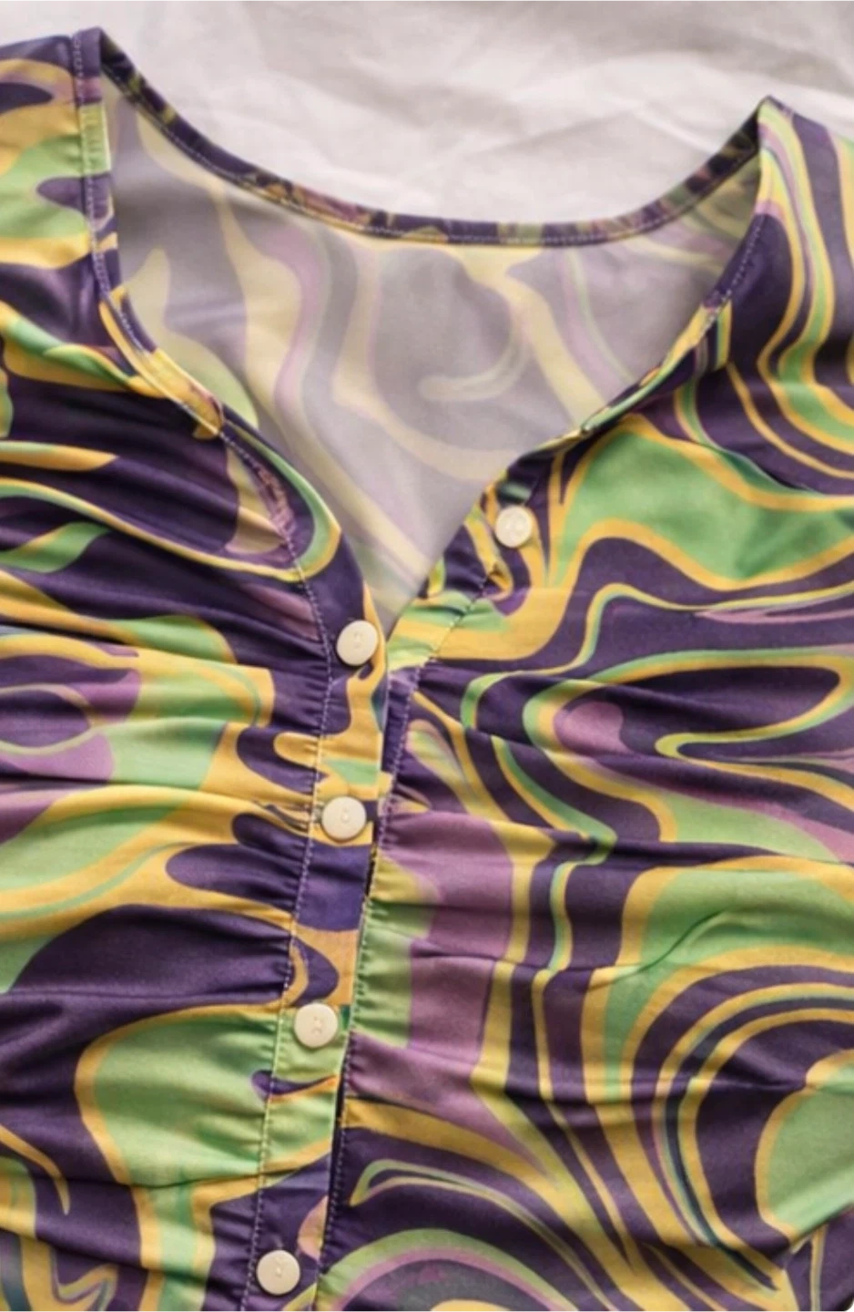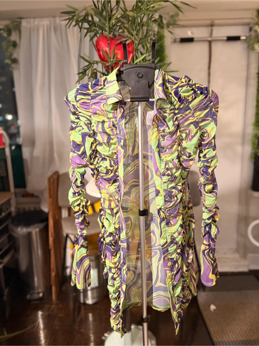 This SHEIN shirt dress features a bold swirly pattern and ruching detail. It has long, ruched sleeves with tie cuffs. The dress is button-down and made in China. Size medium.