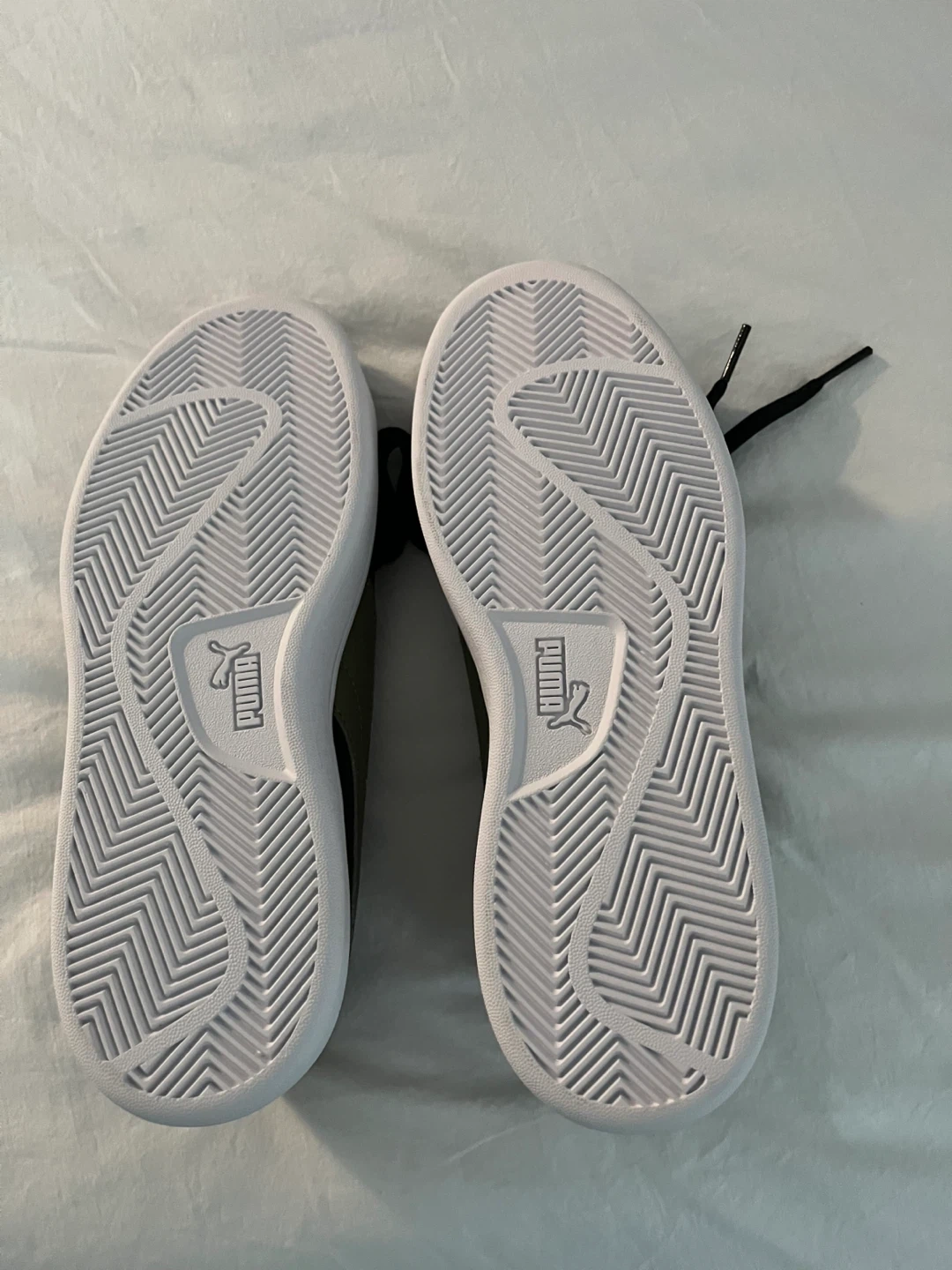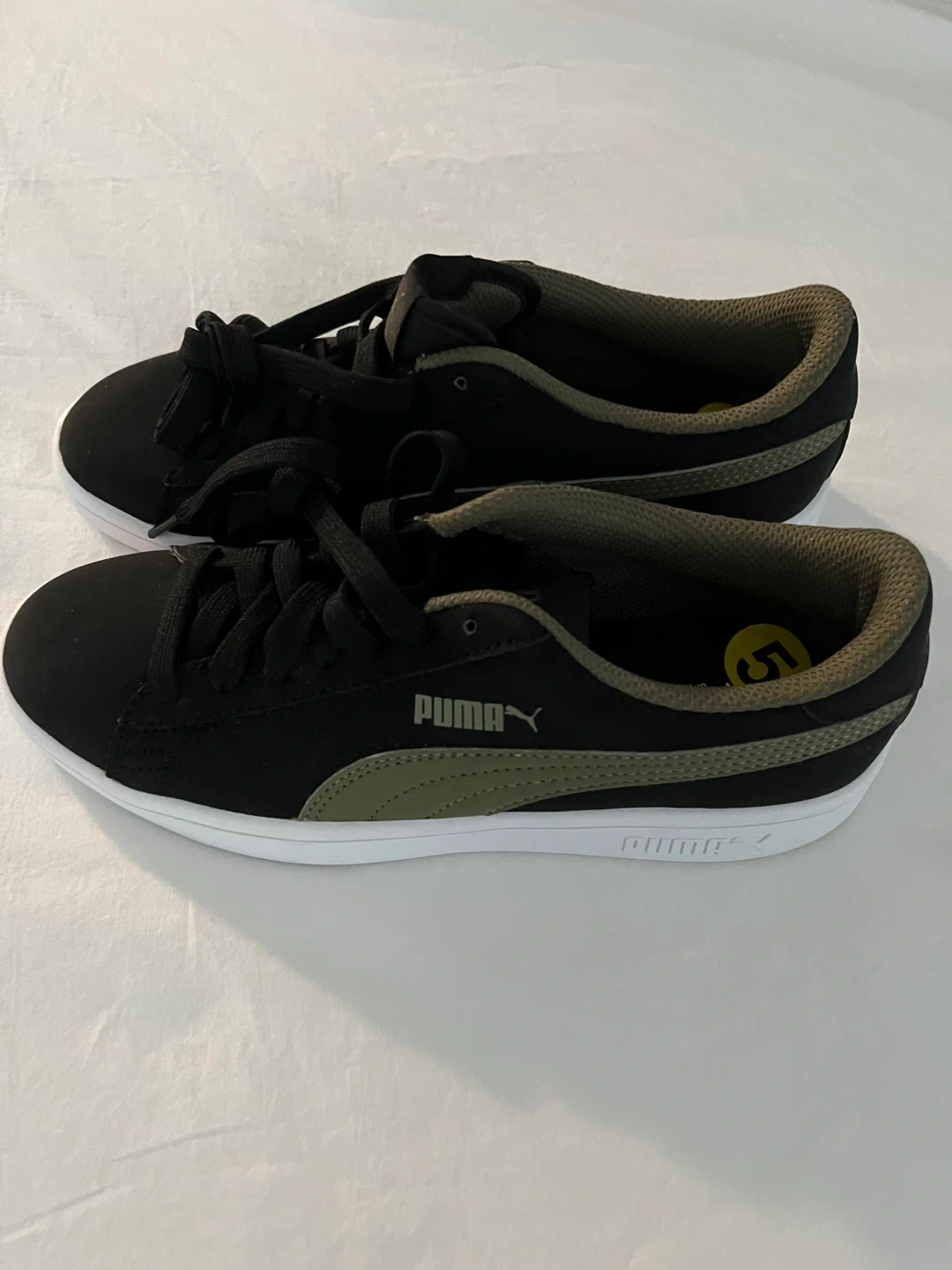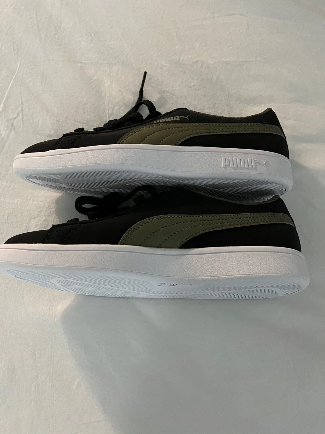 Black Puma Smash v2 sneakers with olive green accents. These casual shoes feature a durable rubber sole and a classic Puma design.
