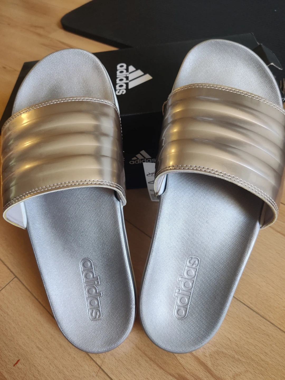 Adidas Adilette Comfort slides in a silver gold and silver colourway. Includes original box and tags. Comfortable and casual, these slides are great for everyday wear or post-workout relaxation.