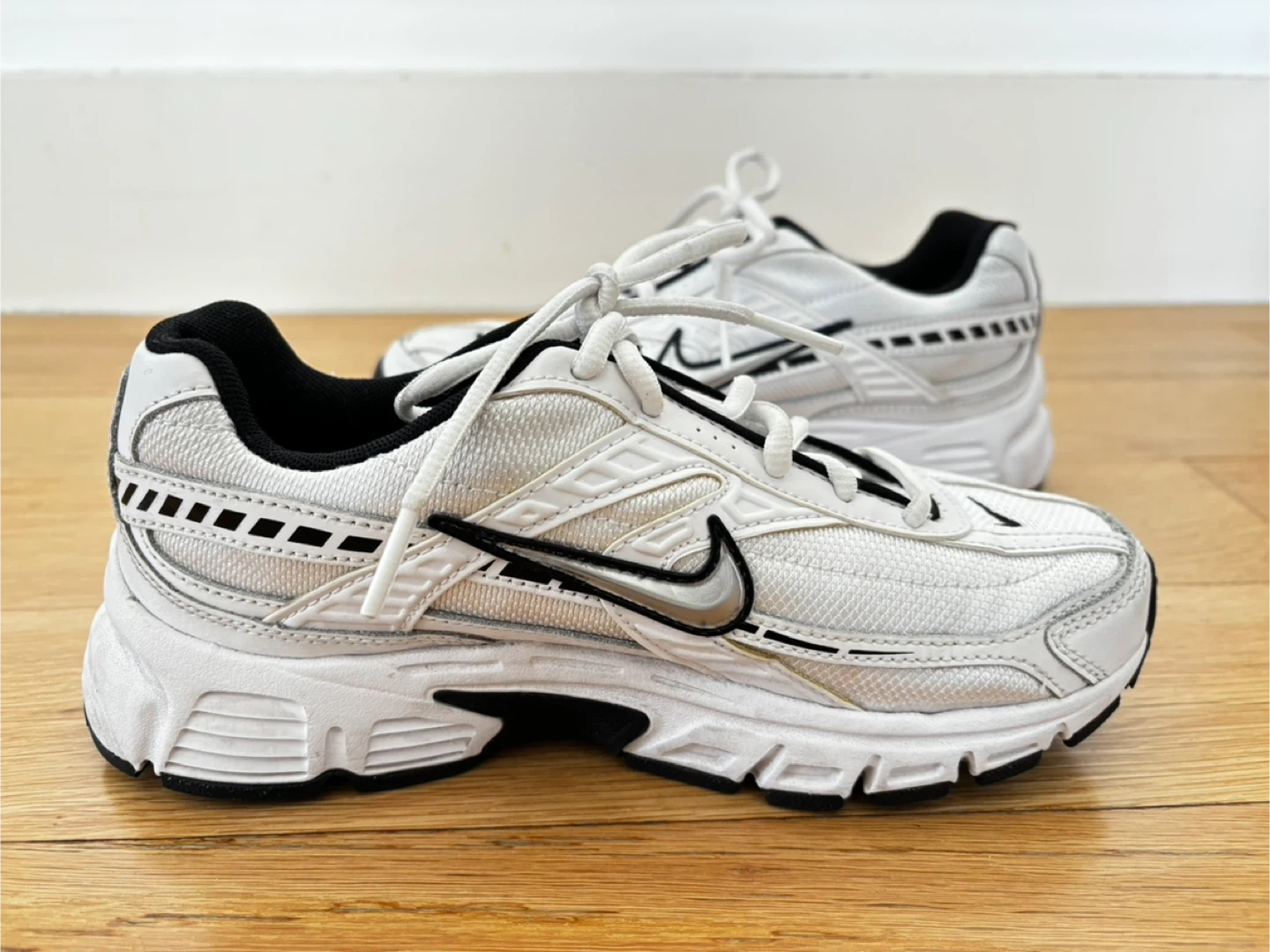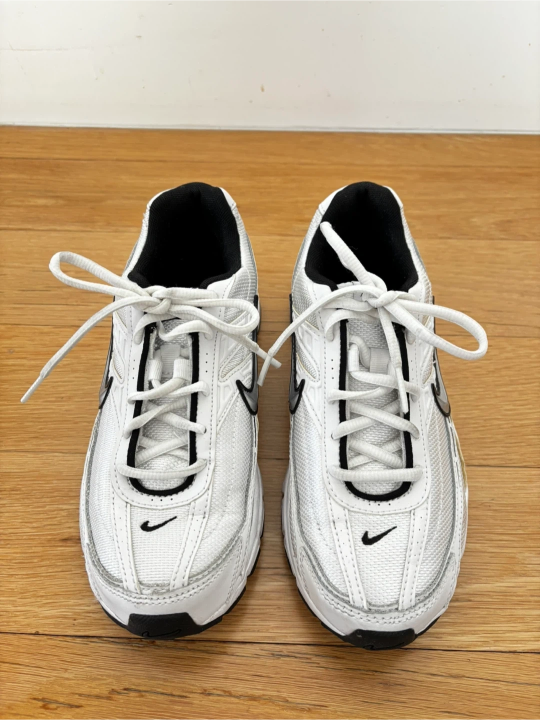 White Nike running shoes. Women's US size 7 (I am 6.5 and fit perfectly). These shoes are designed for comfort and performance. Features a breathable mesh upper and a durable rubber outsole for traction.