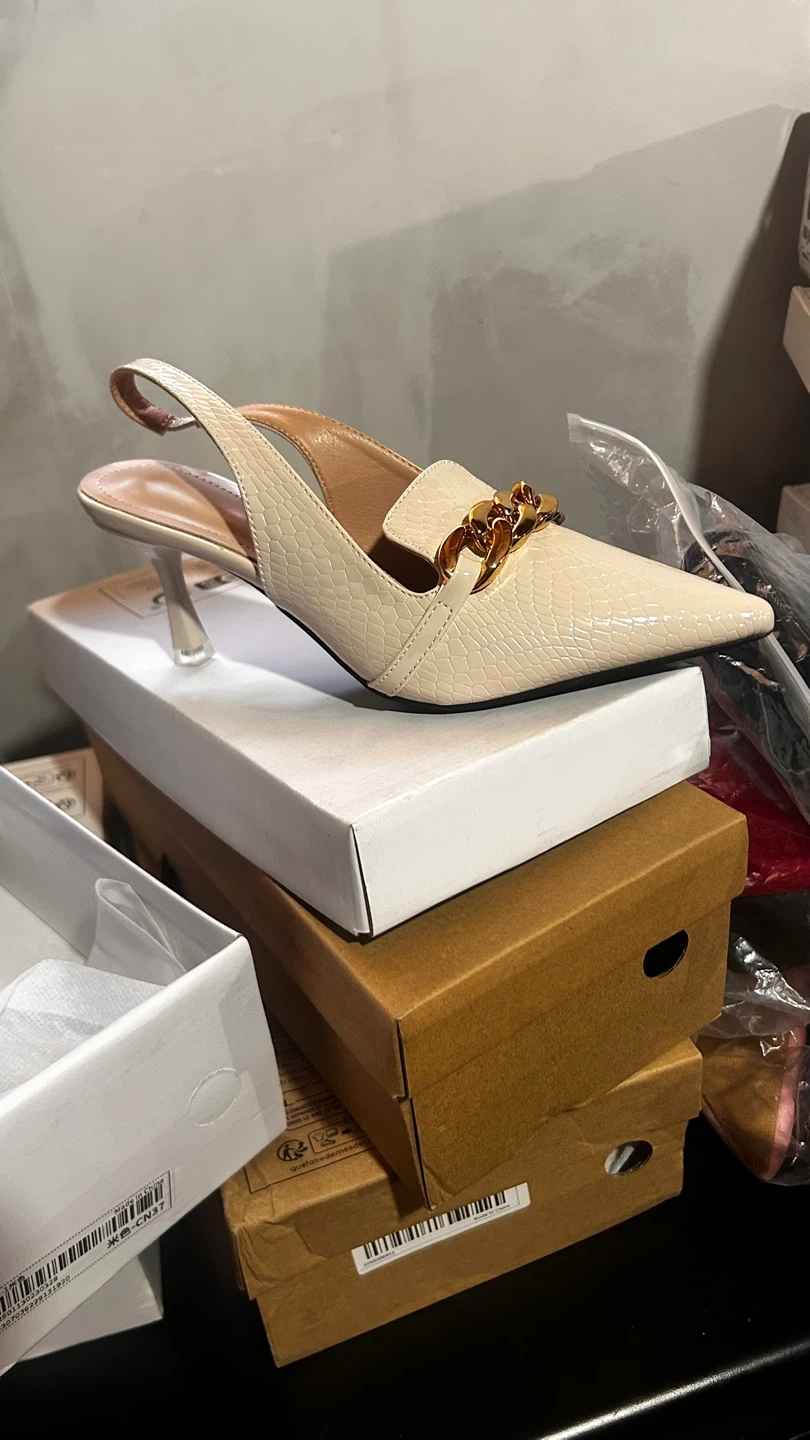 Stylish cream slingback heels with a pointed toe and a decorative gold chain accent. They feature a comfortable slingback strap and a modest heel height. Perfect for dressing up any outfit! Never worn.