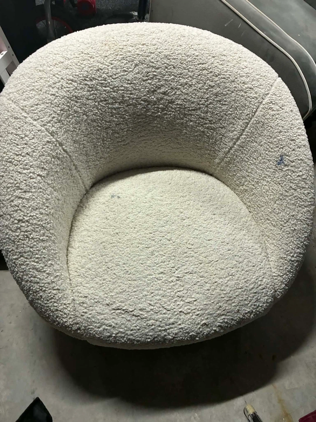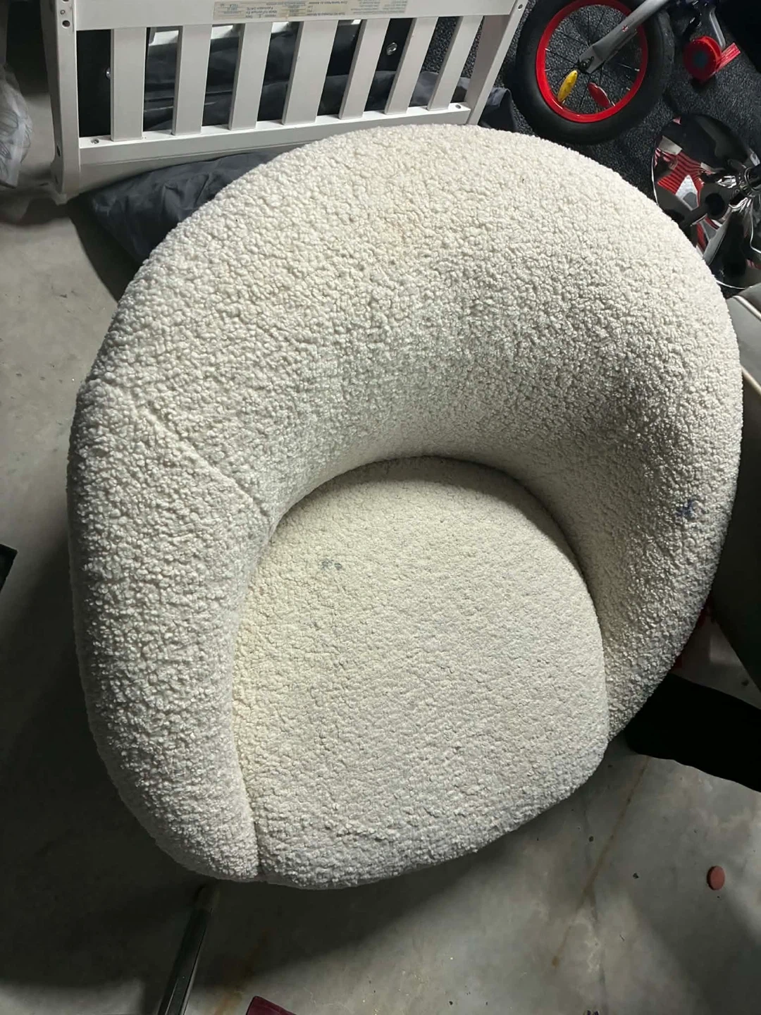 Cozy cream-colored accent chair upholstered in soft teddy sherpa fabric. This round barrel-style chair offers a comfortable spot to relax. Its plush texture and unique shape make it a stylish addition to any room.