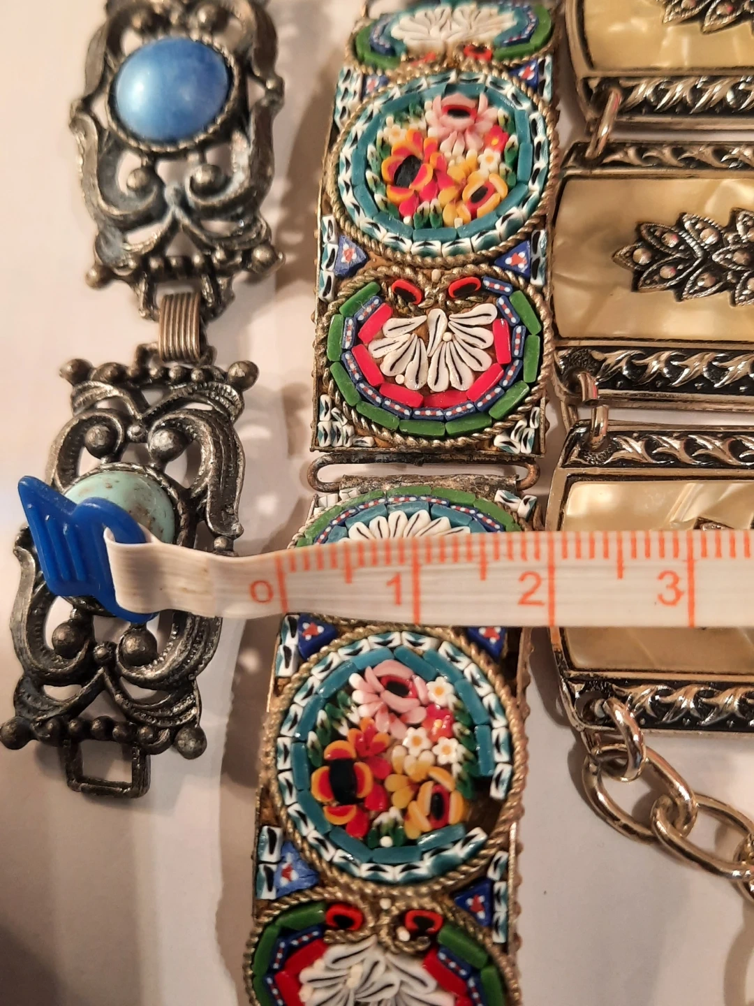 This lot includes three vintage bracelets. Two feature intricate mosaic designs with floral patterns, and one has decorative faux mother-of-pearl panels with floral carvings. These pieces add a unique touch to any jewellery collection!