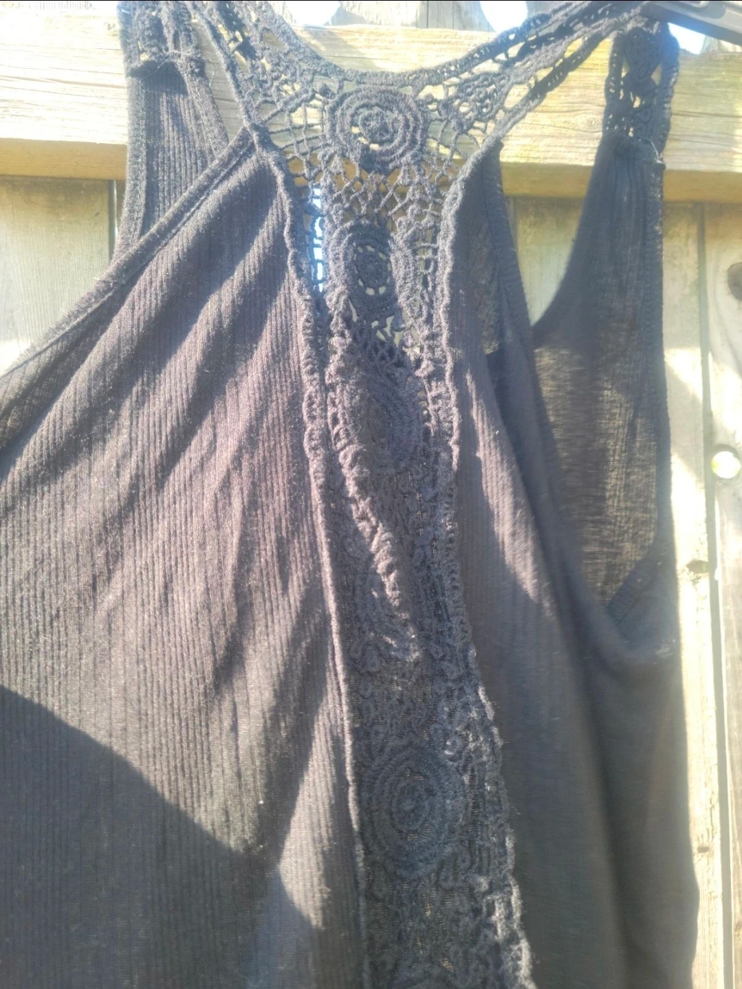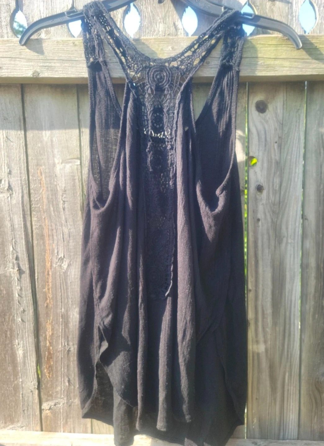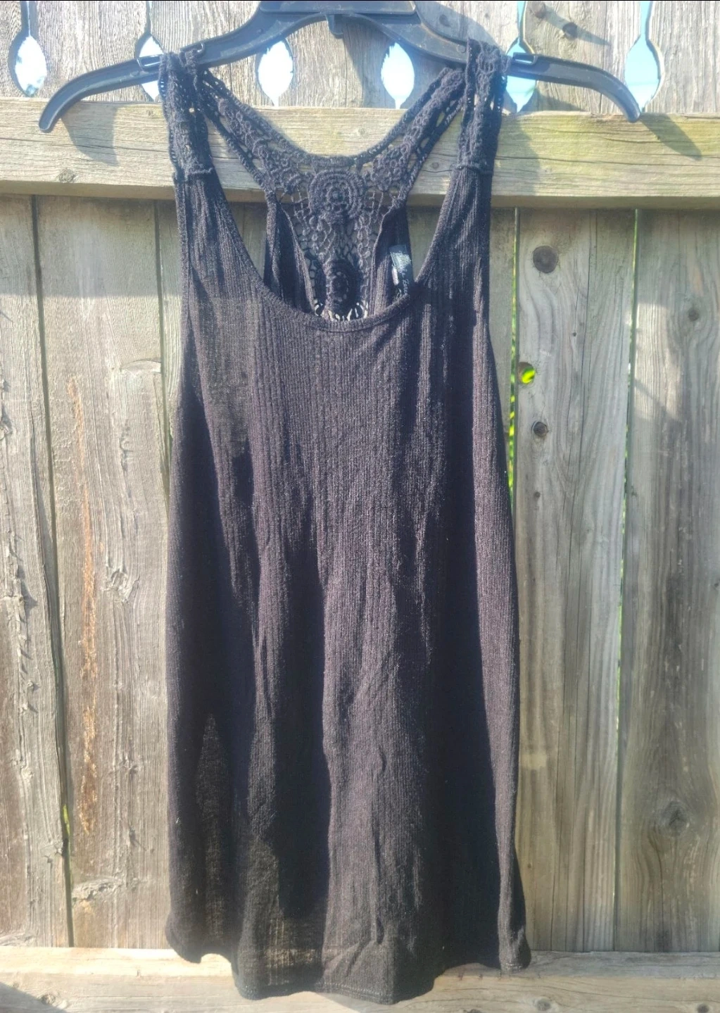 Black tank top with a crochet racerback detail. Lightweight and breathable fabric. Perfect for layering or warm weather wear!