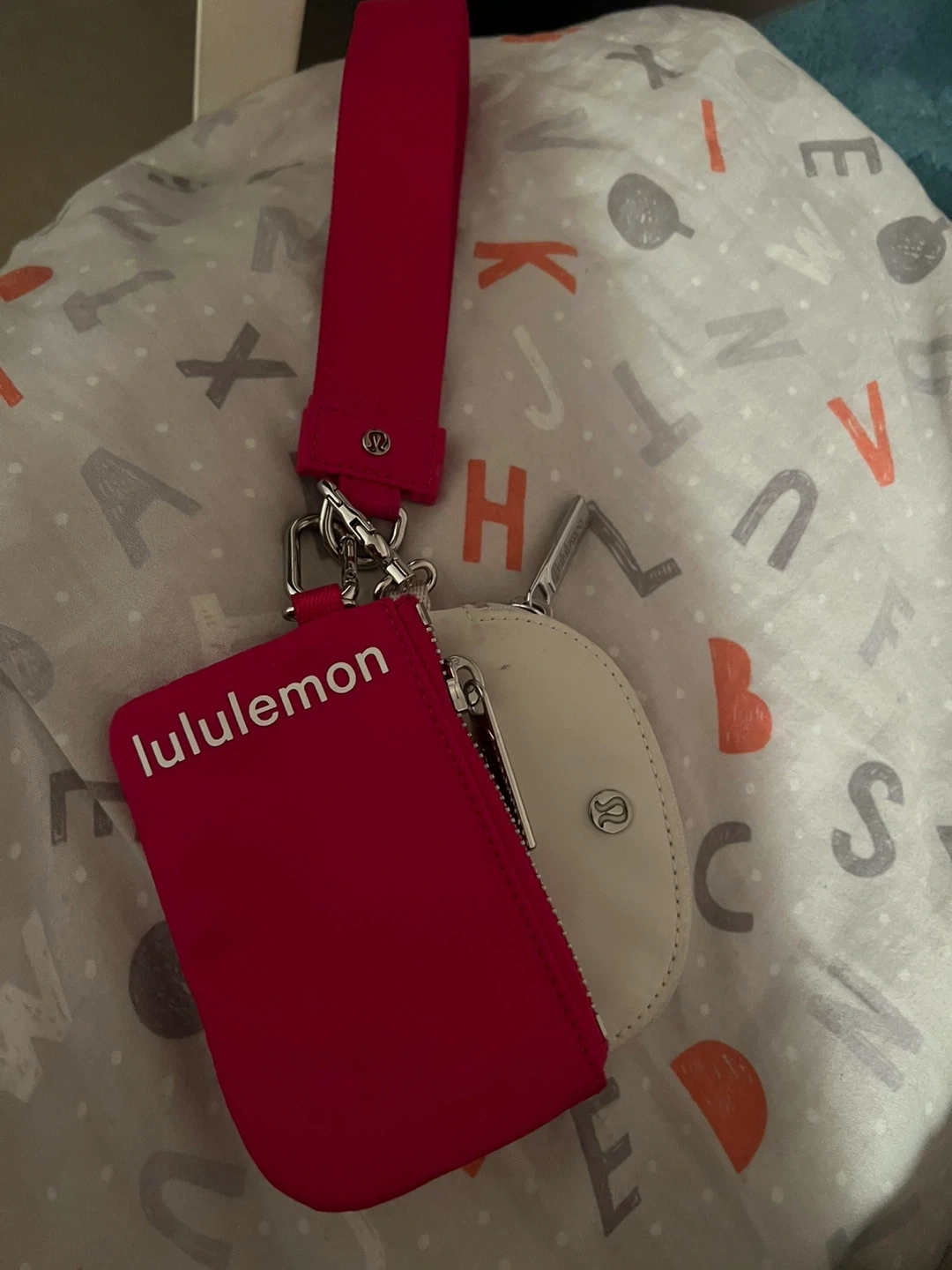 This is a Lululemon wristlet set. It includes a pink pouch and an off-white pouch. Both have zippers.