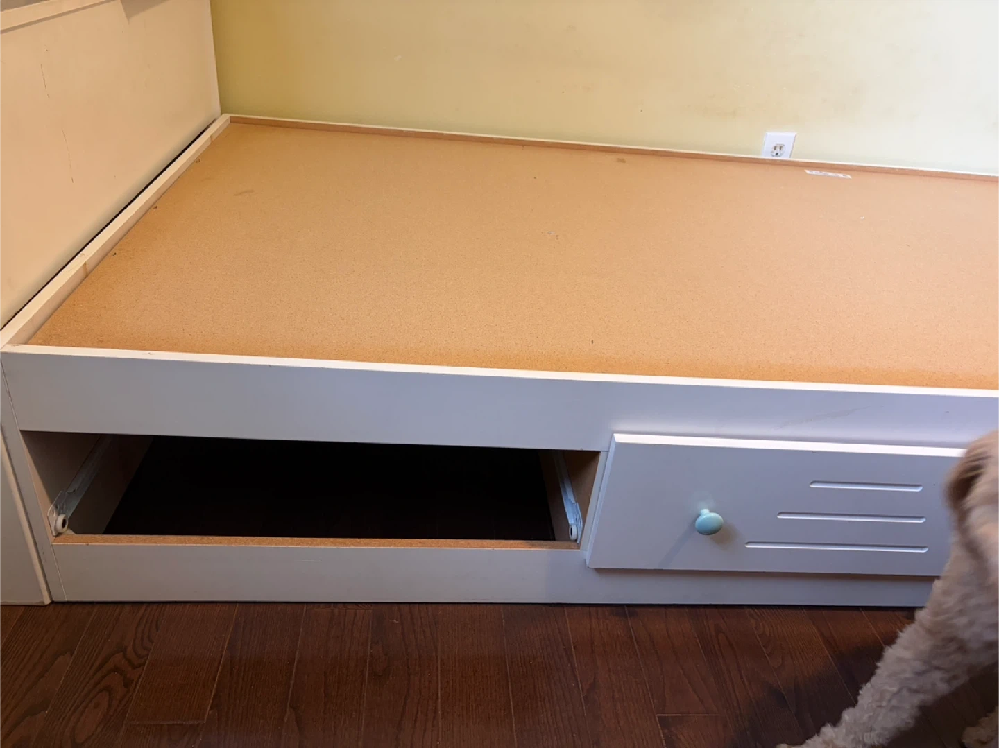 White twin bed frame with built-in storage drawer. Features a sturdy construction with a simple drawer pull. One drawer missing