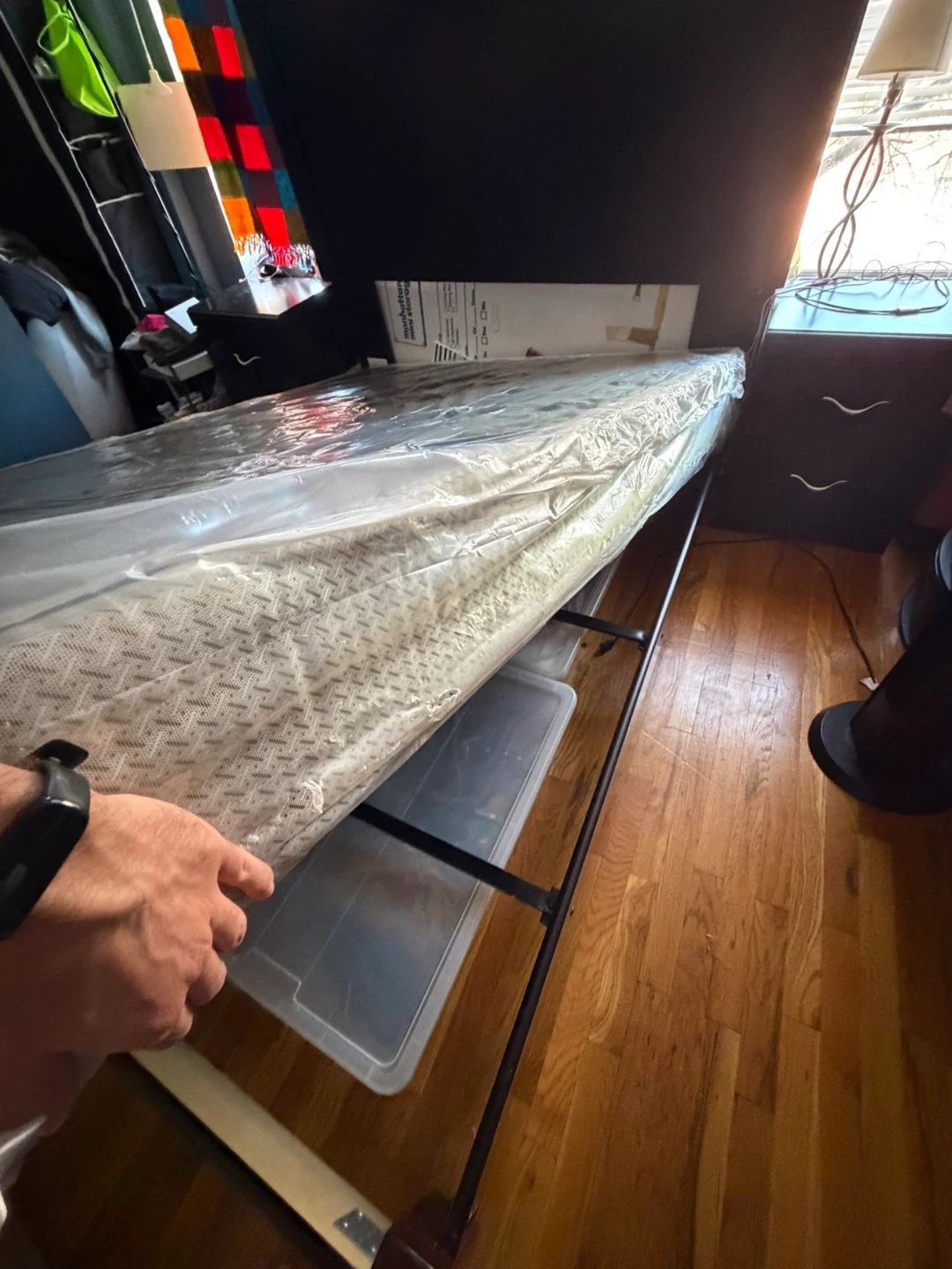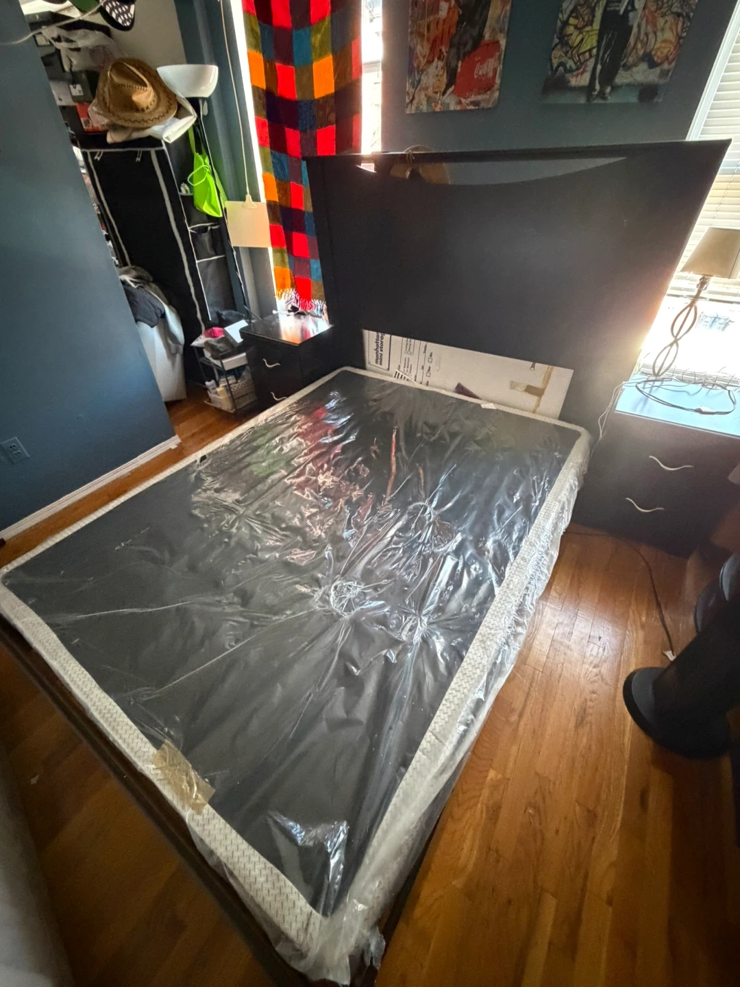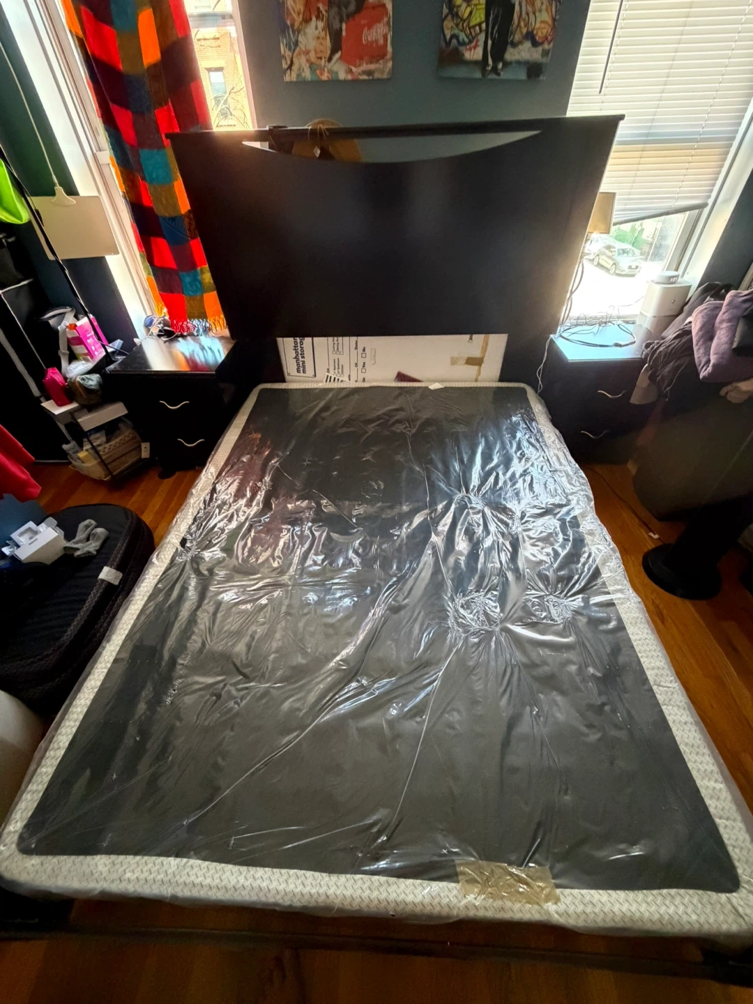 Dark brown queen size standard bed frame with headboard. Includes box spring for support. Easy to assemble/ disable. 60x 80