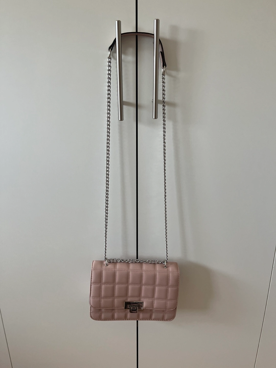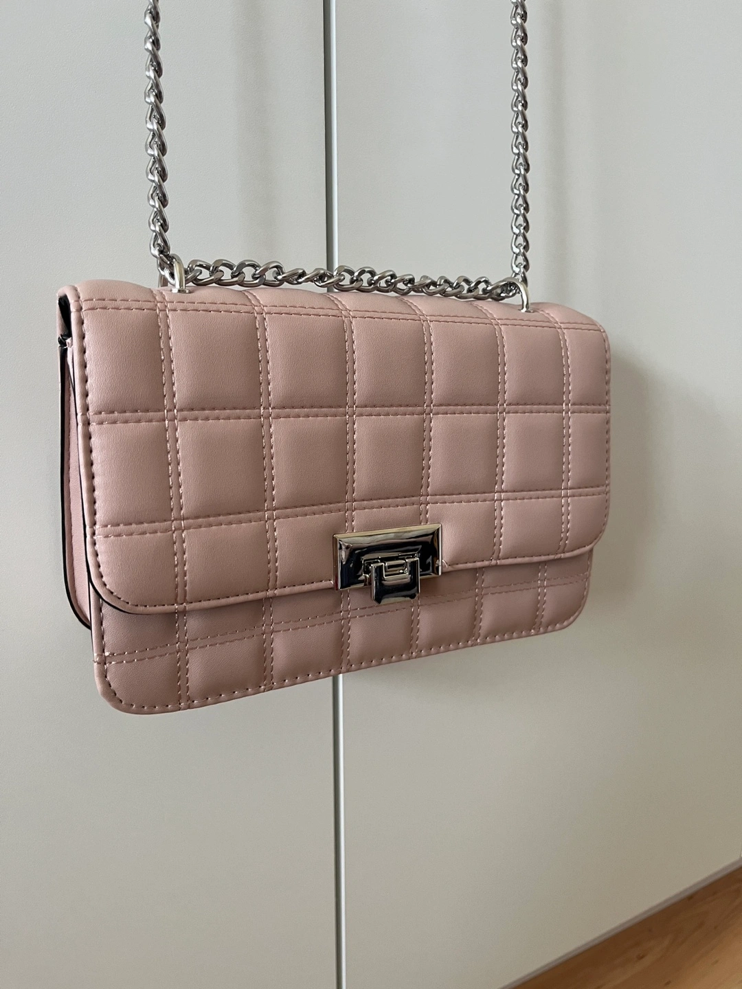 ❀ Small pink quilted bag with silver chain strap. Flap closure button with silver hardware.