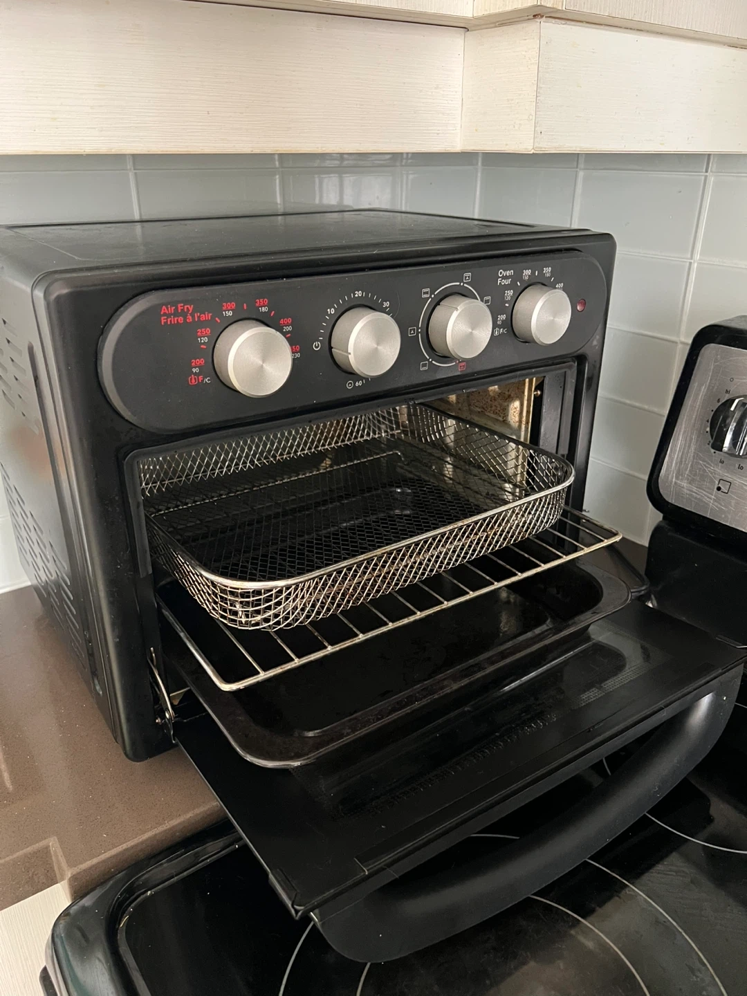 Black countertop air fryer toaster oven. It has multiple cooking functions including Air Fry, Bake, Broil, and Toast. The oven comes with an air fry basket and baking tray.