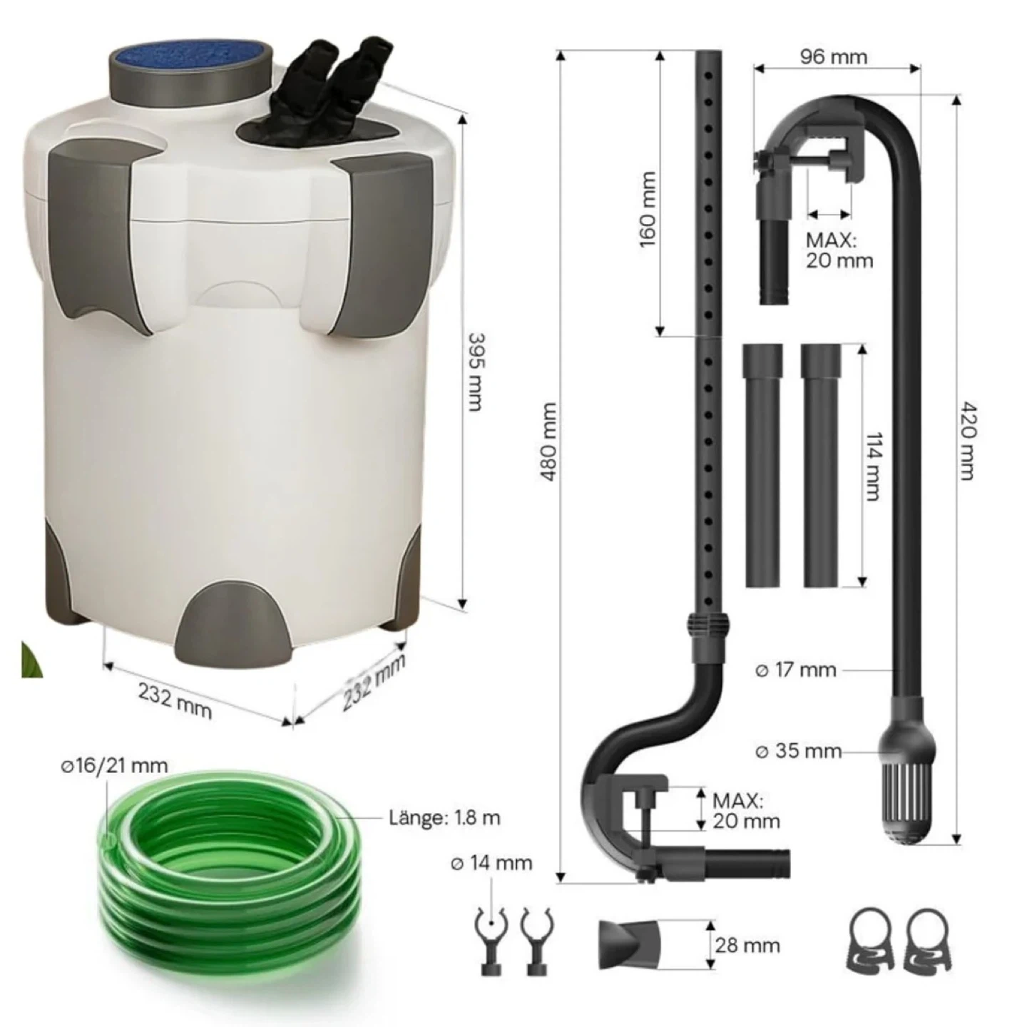 Complete setup kit includes hoses, intake/outlet parts, and all necessary components