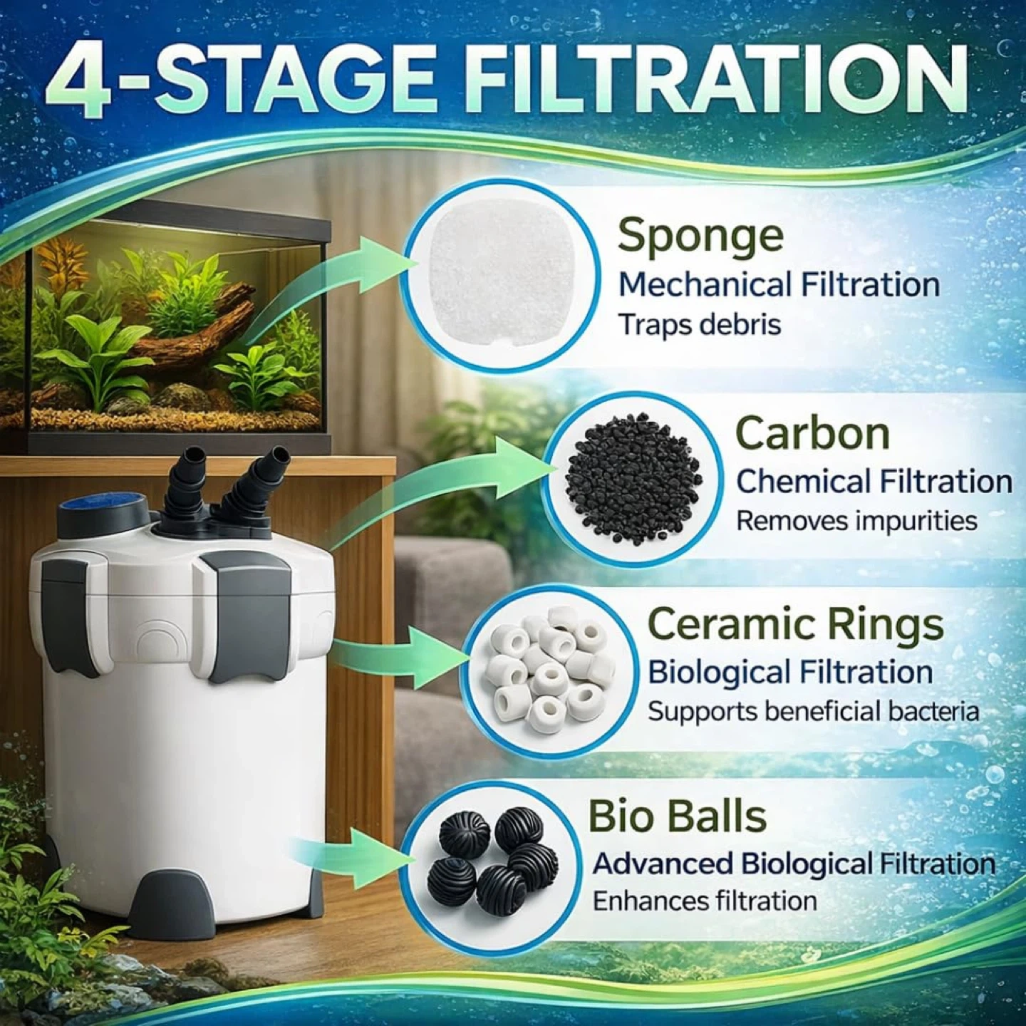 3-stage filtration system: mechanical, chemical, and biological filtration for clear water