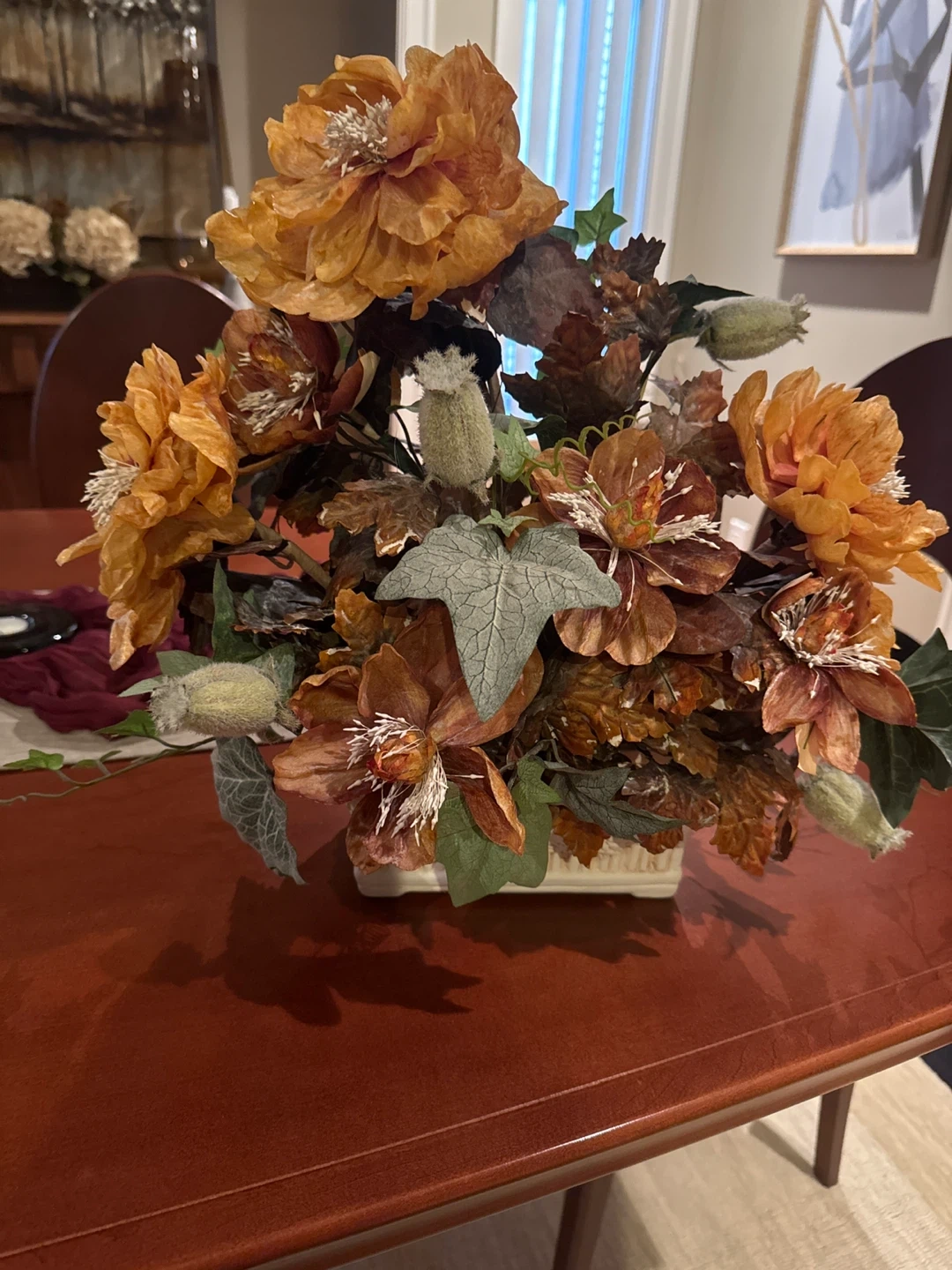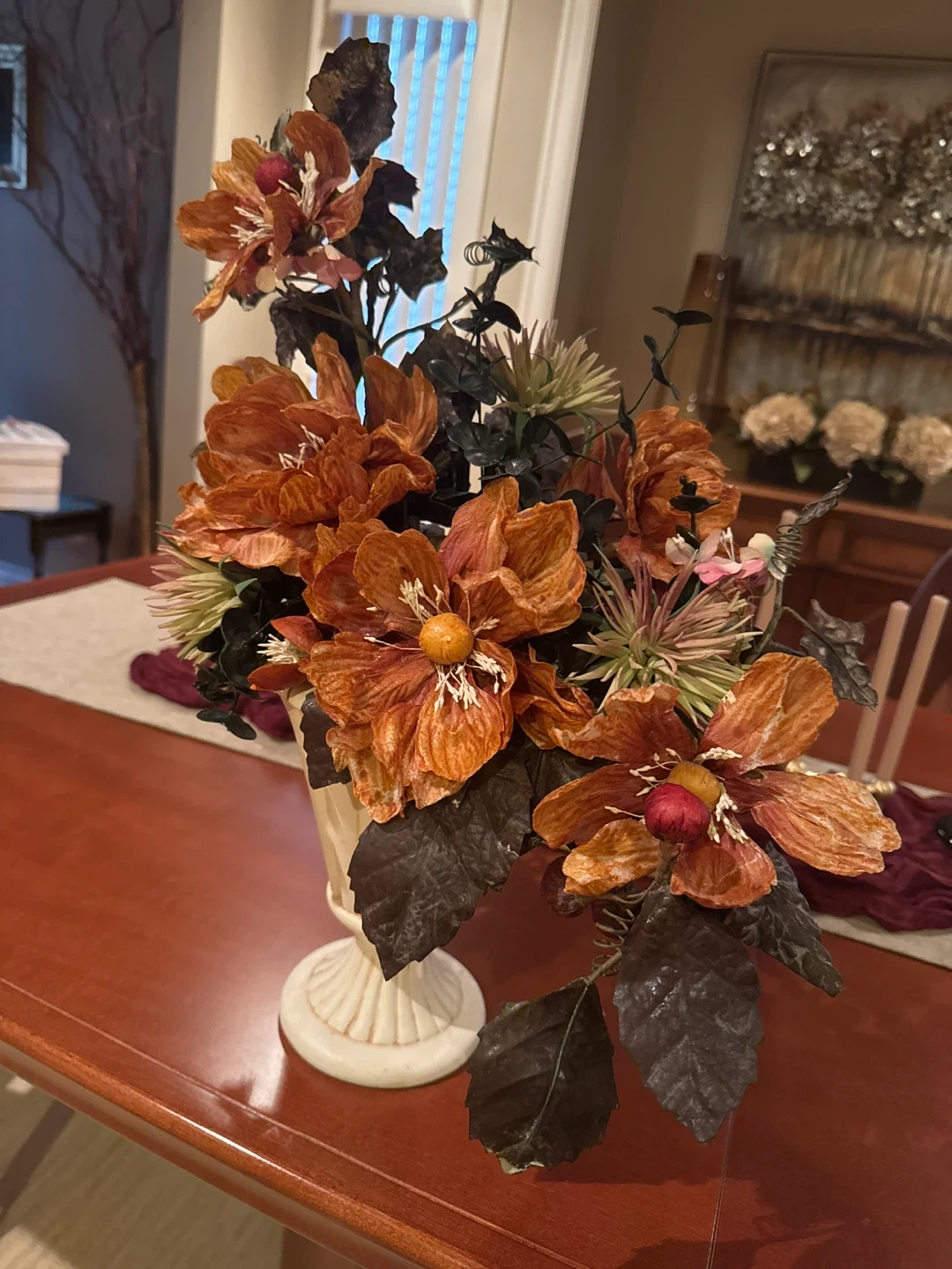 Two beautiful High Quality faux flower arrangements featuring large orange and brown blooms with greenery and buds. This decorative piece comes in a cream-coloured vase. It's perfect for adding a touch of fall or rustic charm to any room. These two arrangements are selling at $300 a Piece in Stores,