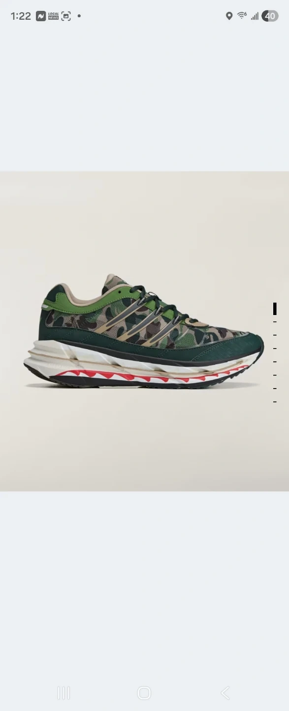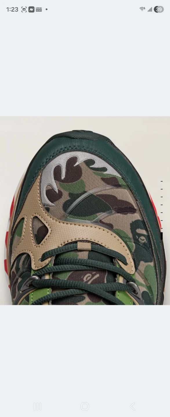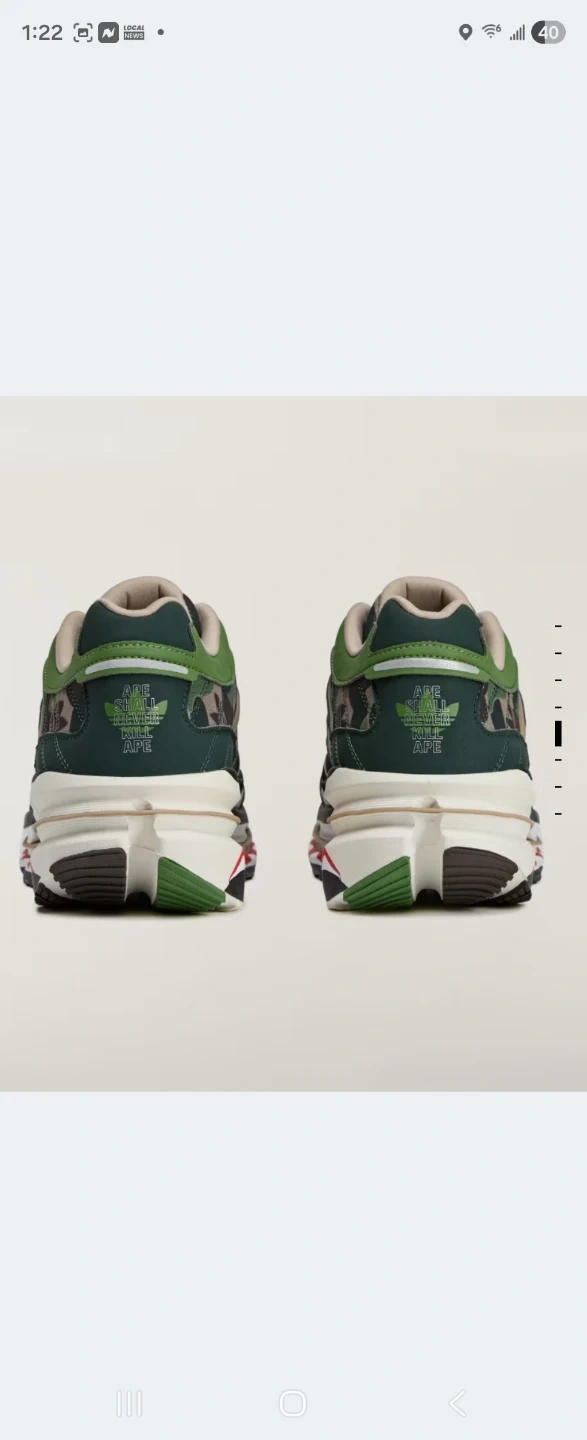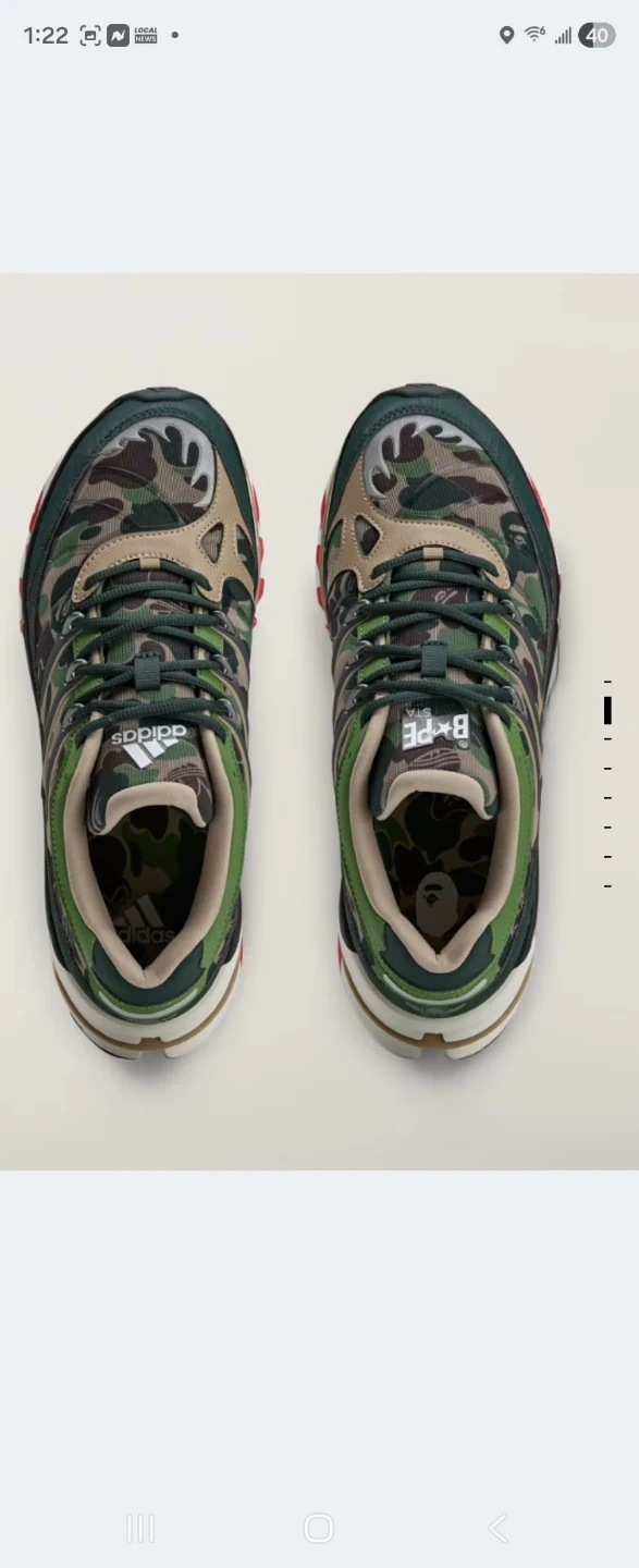 These Adidas x BAPE running shoes feature a signature camouflage pattern. The shoes have a comfortable design with a durable Continental rubber outsole. It's a unique collaboration for any sneaker enthusiast!