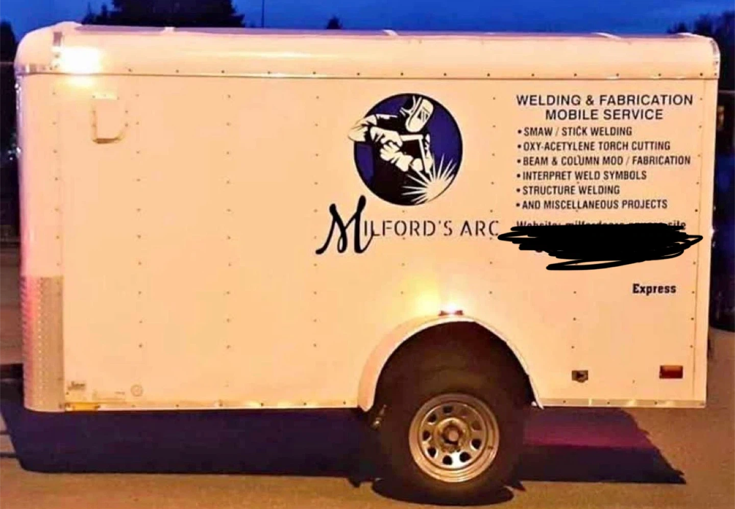 Enclosed cargo trailer. Ideal for mobile welding and fabrication services. Features ample interior space for tools and equipment. Shelving can be removed easily.