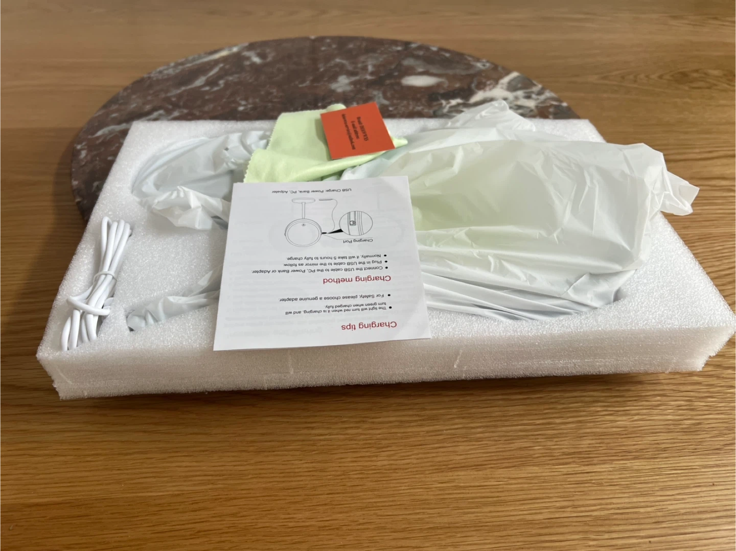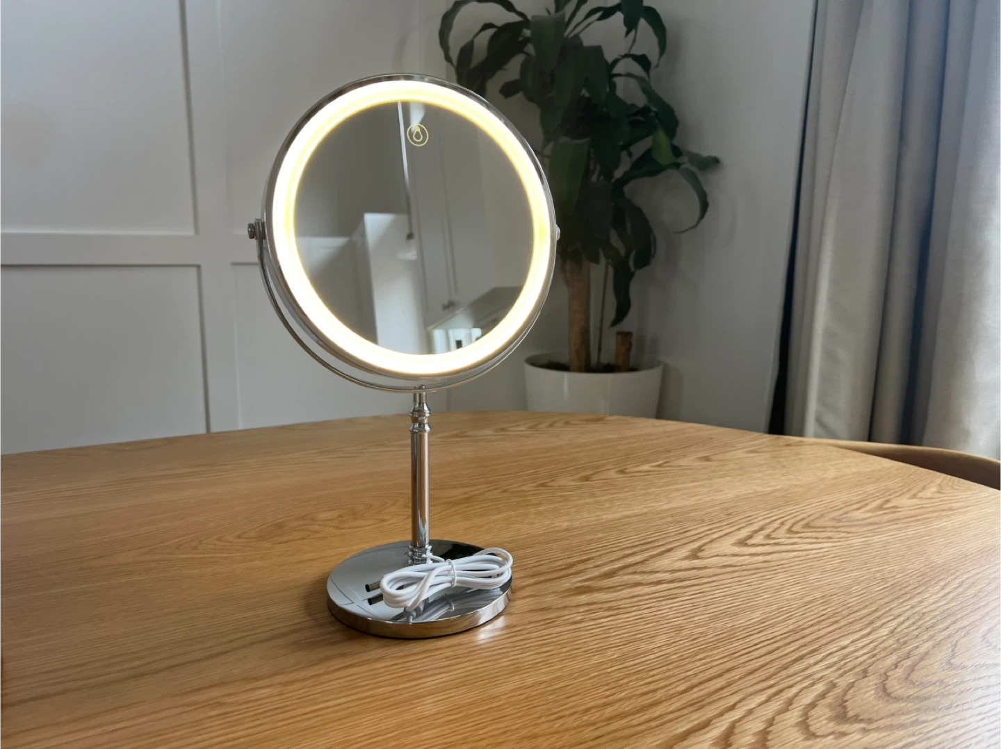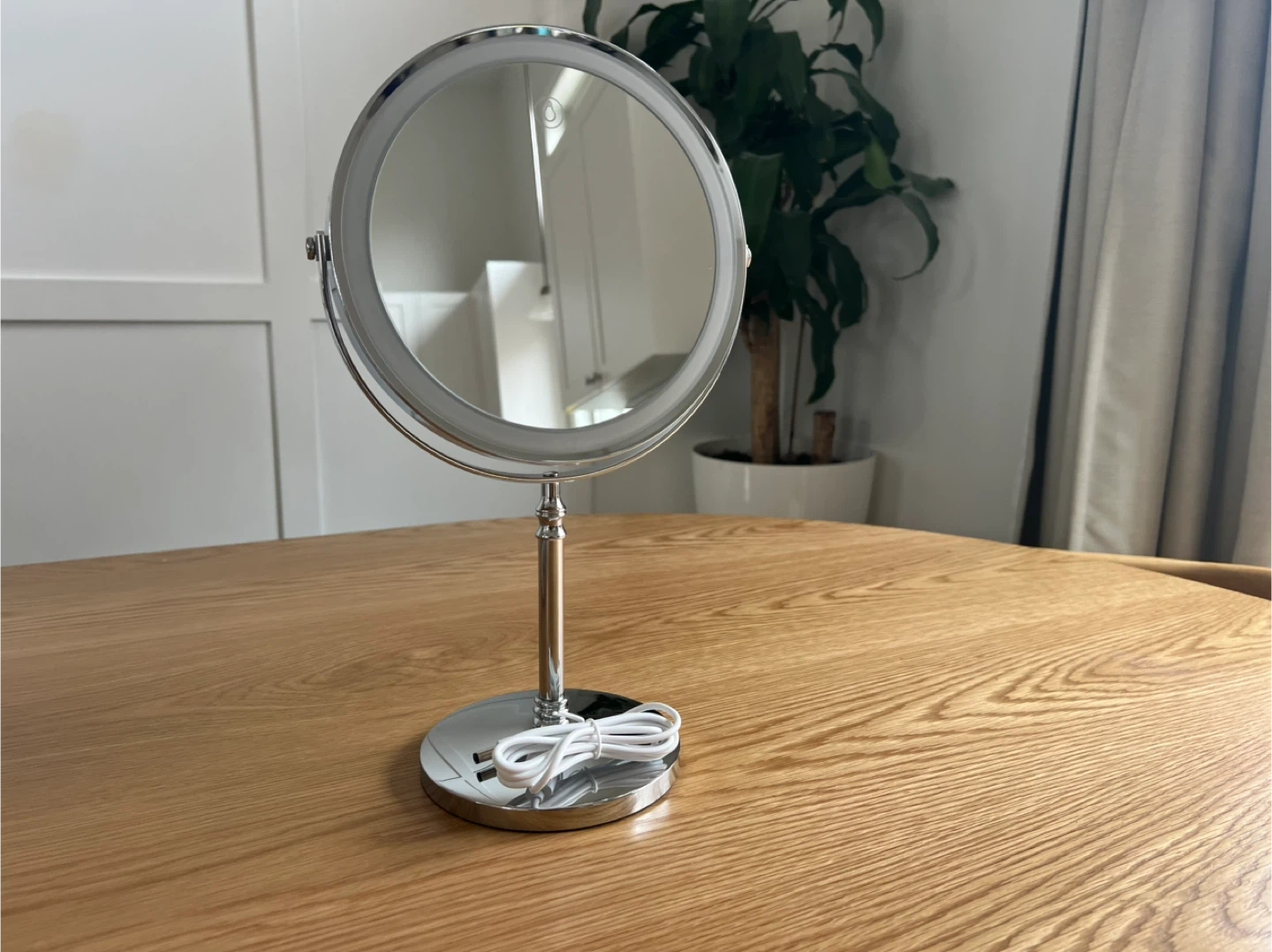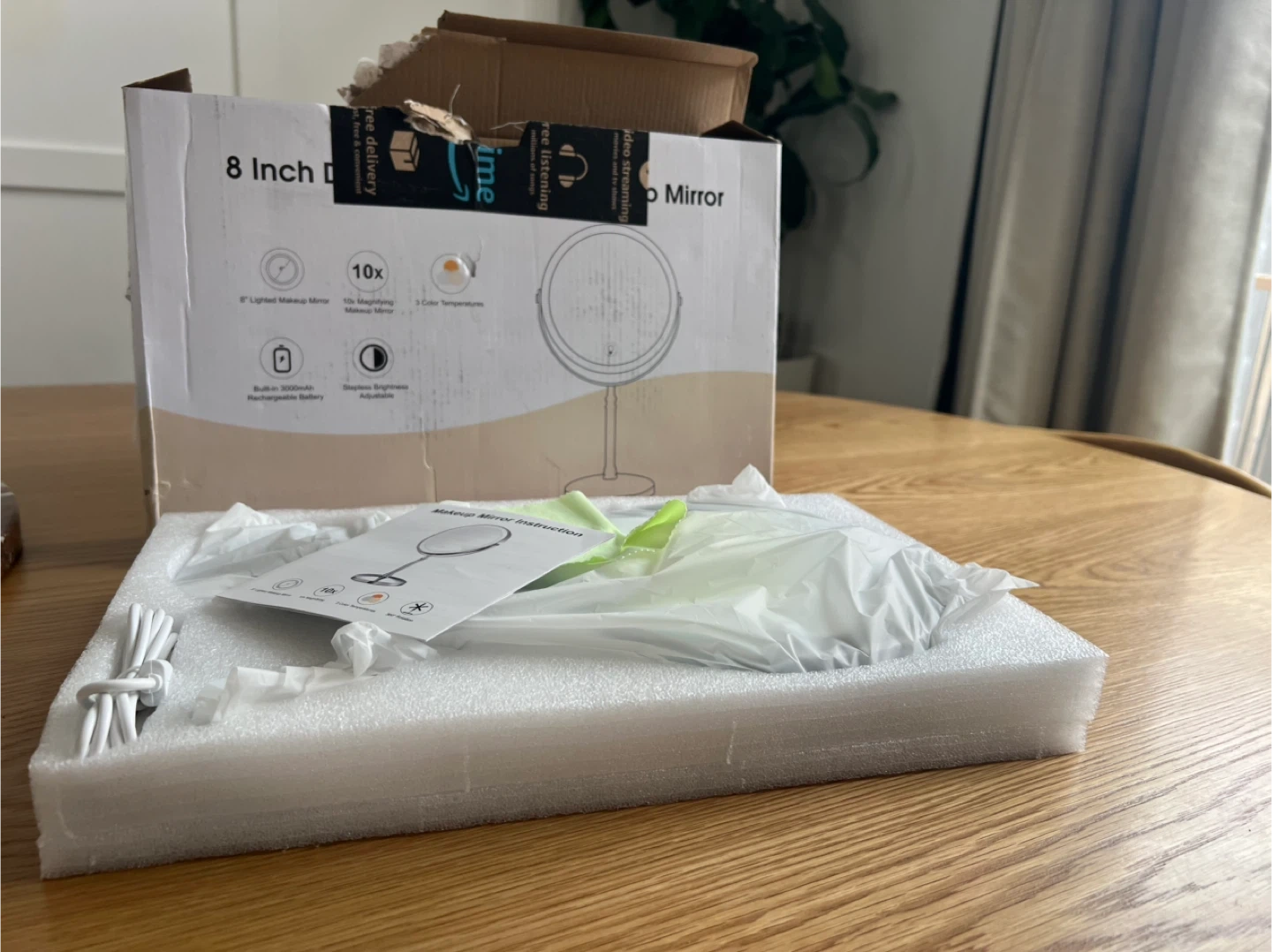 This is an 8-inch LED makeup mirror with 10x magnification. It offers three color temperatures and adjustable brightness. Features a rechargeable battery and includes a USB cable.
