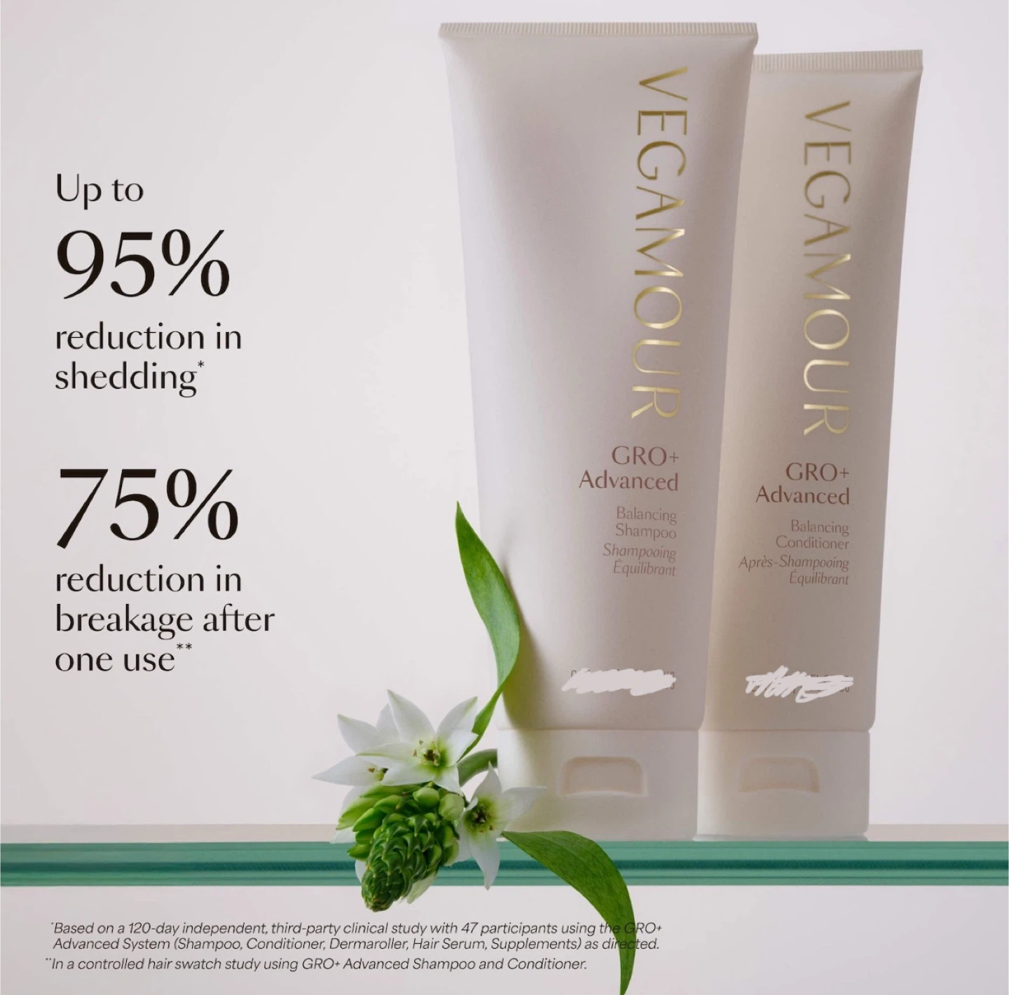 This mini VEGAMOUR includes the GRO+ Advanced Balancing Shampoo and Conditioner. It's formulated with plant exosomes and VEGASPHERE liposomal delivery system. Based on a 120-day study, it shows up to 95% reduction in shedding.