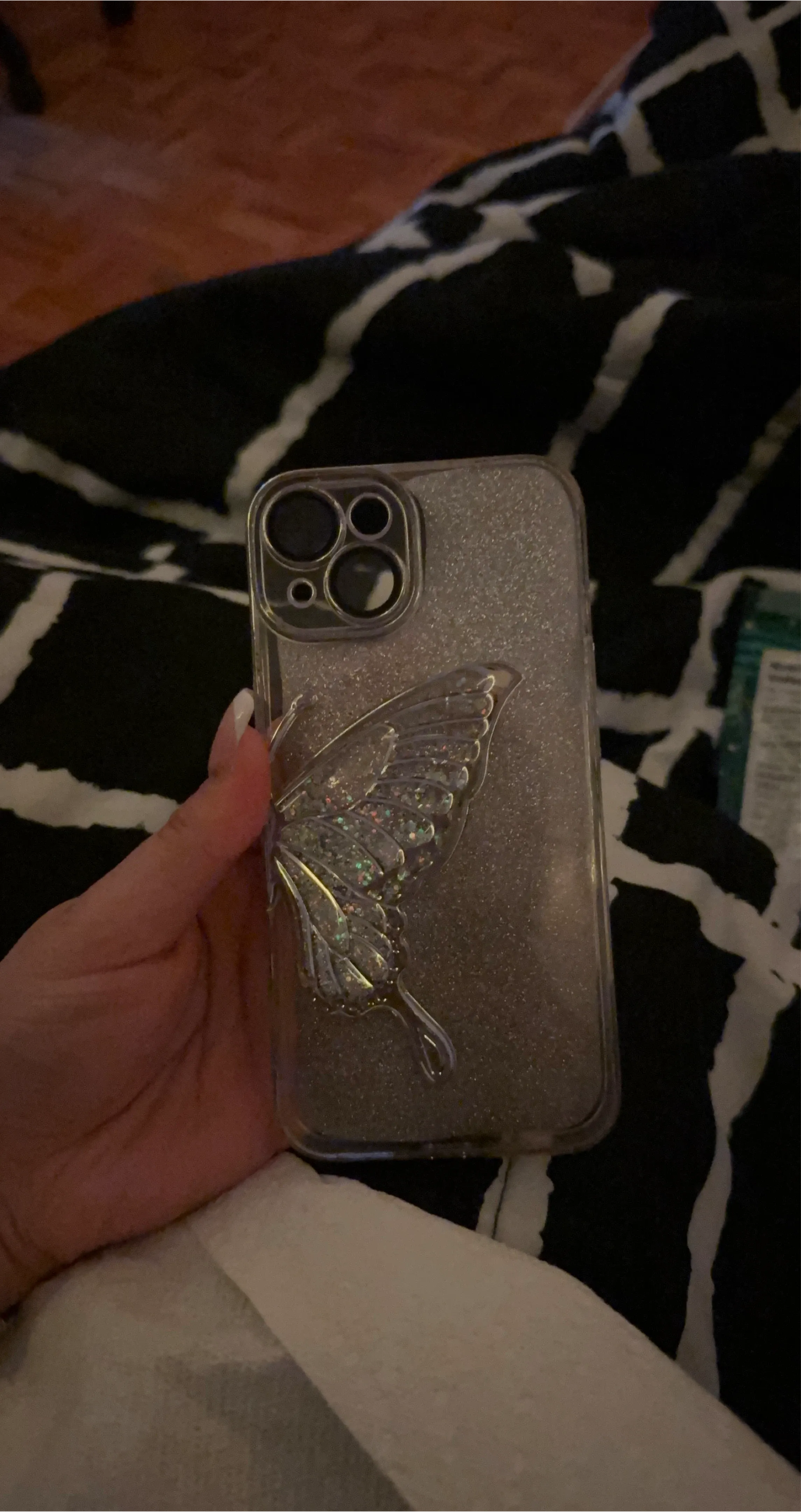 Selling a cute iPhone case featuring a sparkly butterfly design with a little signs of use! It's in great condition and would look great on your phone
