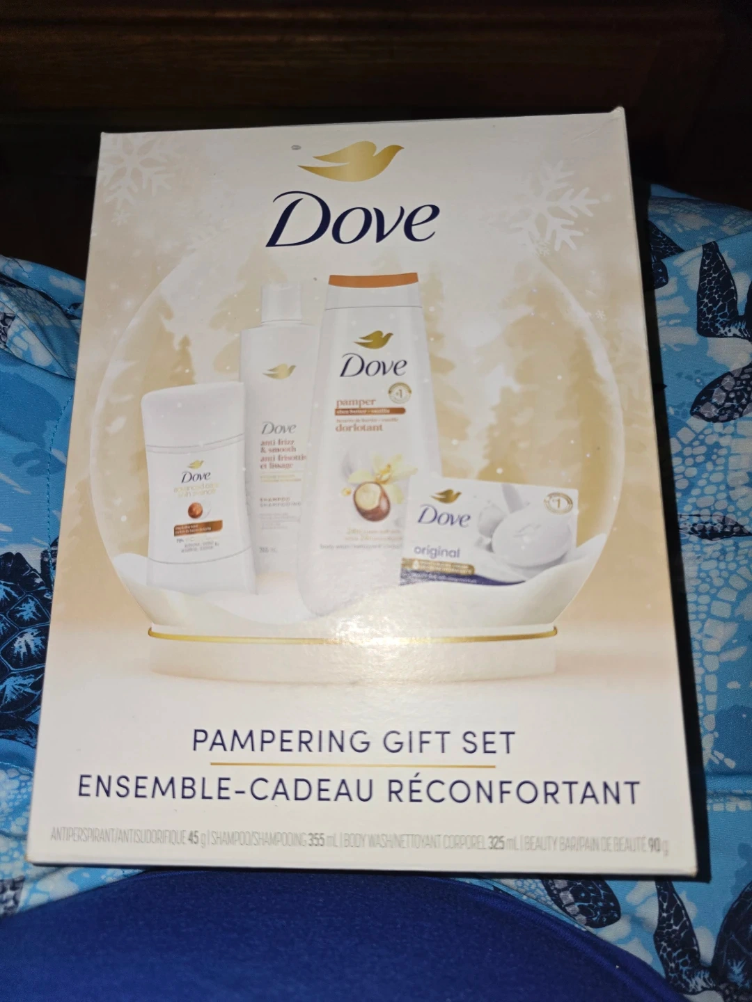 This Dove gift set includes antiperspirant (45g), shampoo (355 mL), body wash (325 mL), and a beauty bar (90g). It's a nice way to treat yourself or someone else.