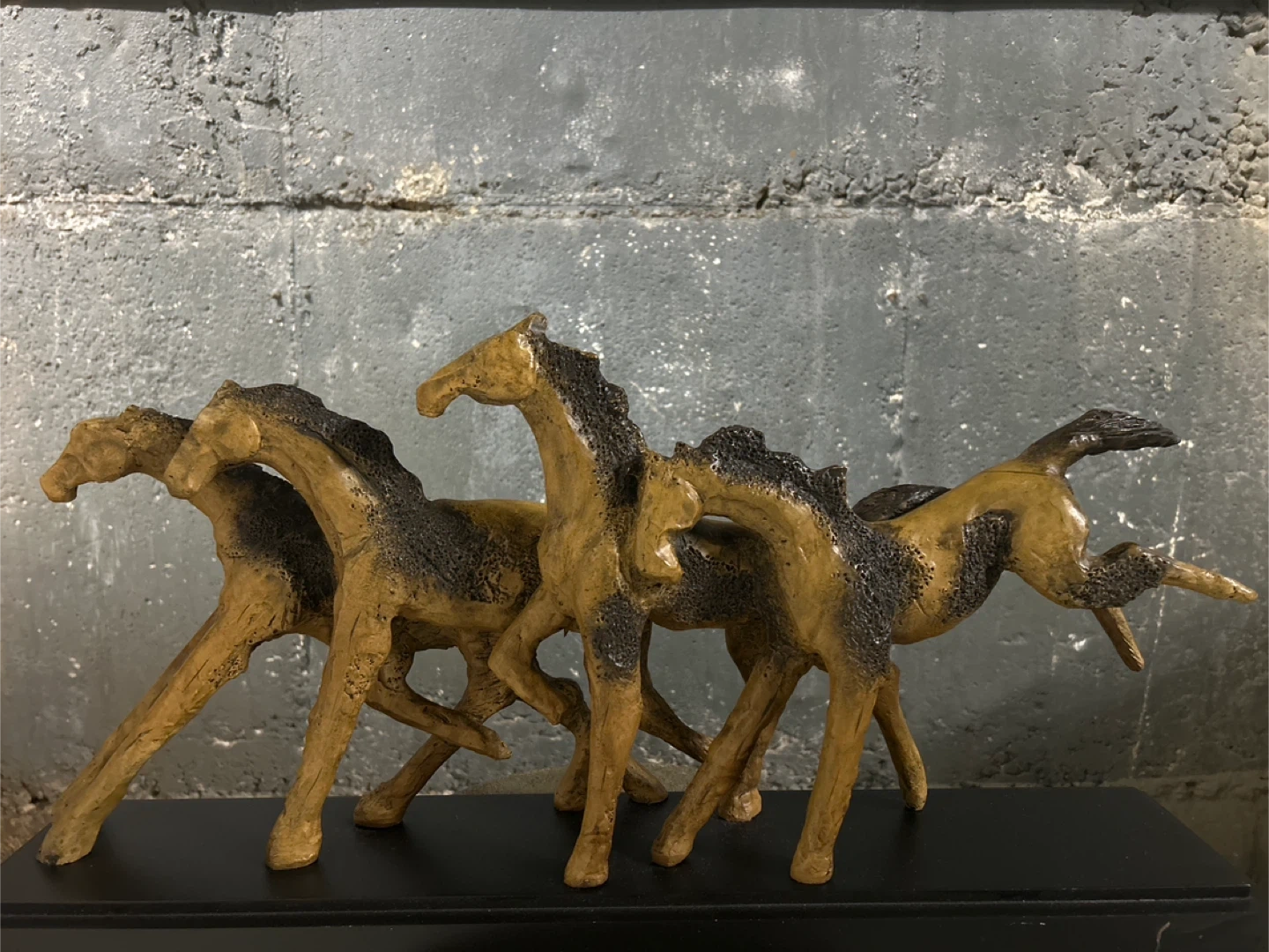 A striking sculpture featuring four horses in mid-gallop. It's mounted on a sleek black base. The material appears to be resin with a bronze finish. Great for adding a dynamic touch to your decor!