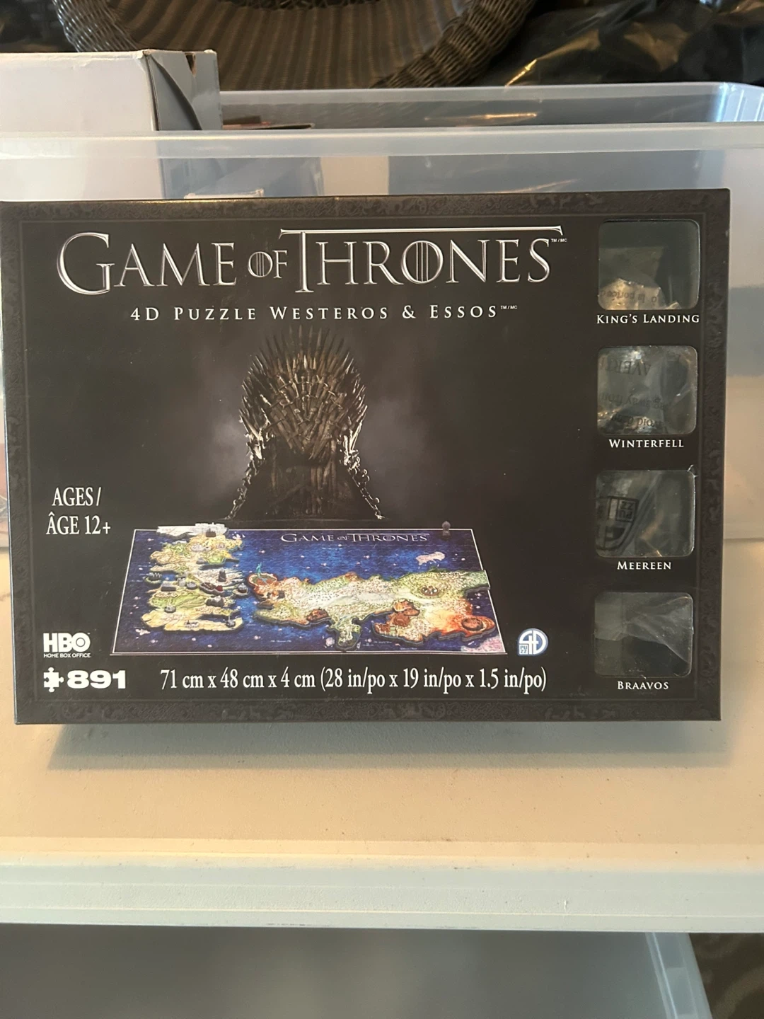This is a Game of Thrones 4D Puzzle of Westeros & Essos. It's for ages 12+. Finished puzzle measures 71 cm x 48 cm x 4 cm. Comes with components for King's Landing, Winterfell, Meereen, and Braavos.